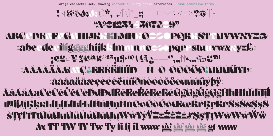 In a typeface category that has been sorely under-represented until now, Aziga is a high (occasionally reversed) contrast, postmodern, deconstructed-reconstructed, serifless (mostly), fashion Didone! Aziga lends itself to being set loud and proud, and the consistent angles throughout the glyphs make it a good candidate for more abstract typographic compositions. This is an unusual font, that’s for sure, but give it a try, and you’ll be rewarded with layouts that really stand out from the crowd.
