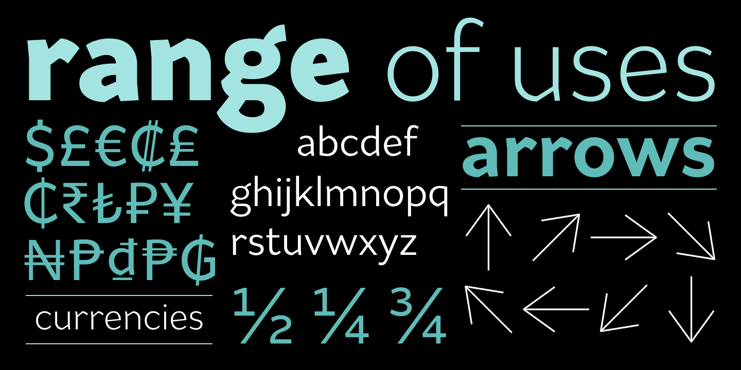 Range Sans is a contemporary grotesque sans serif font family. Created for those detailed project briefs such as corporate identities, information design, and logos, where one wants something slightly idiosyncratic and intriguing. However, the openness and spacing work well in running text, too. Because it mirrors design details similar to those in Range Serif, both families make for a natural font pairing, thus expanding the typographic range available for conquering whatever your client needs.