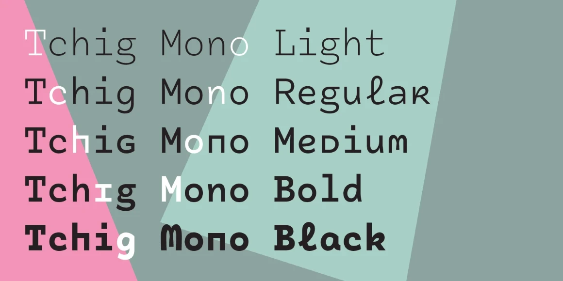 This is Tchig Mono, a monospaced font family not taking itself too seriously. It has a playful spirit with a few surprises. Stylistic sets offer cropped lowercase forms with a small-caps-like feel, plus a selection of alternates giving the text a slightly alien feel. Useful for coding and technical information? Sure! However, the more unorthodox shapes have a quirky vibe appropriate for postmodernist layouts, independent films, pop-up restaurants, and other out-of-the-box designs.