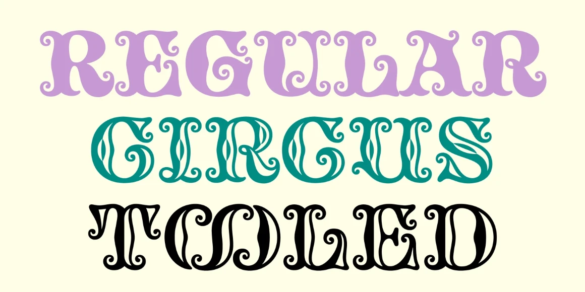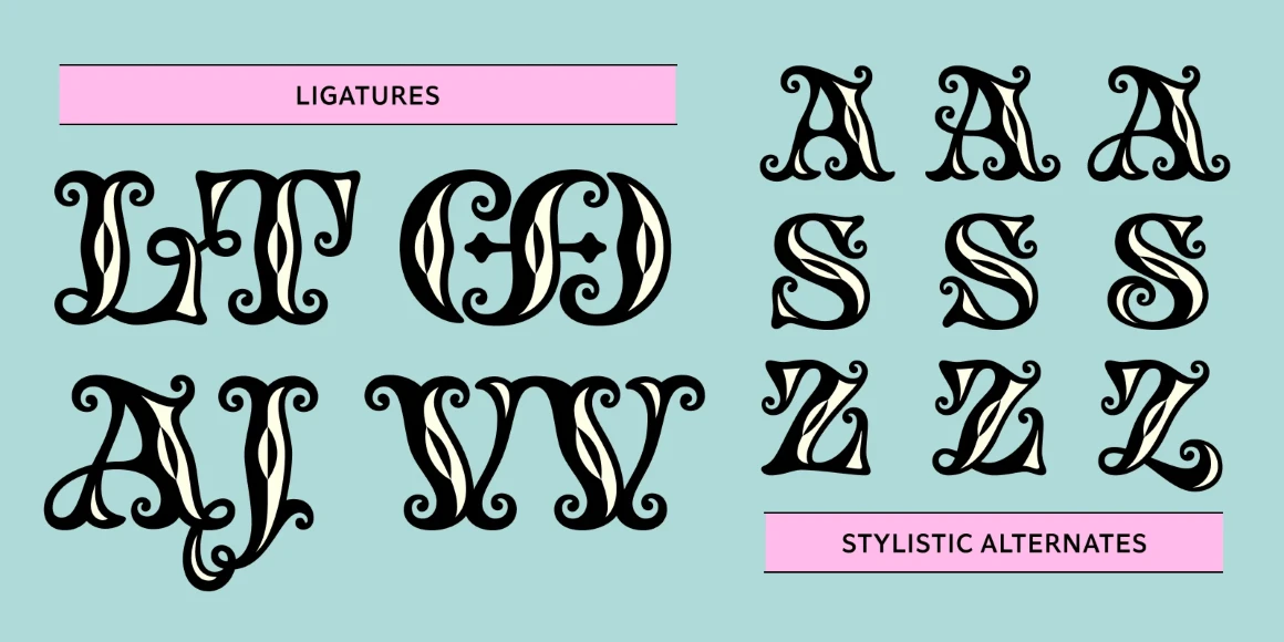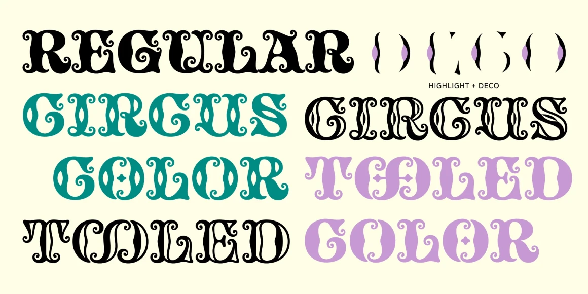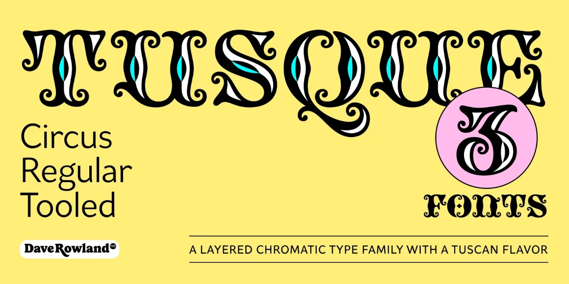 Tusque is a chromatic family with a Tuscan flavor. Regular, Circus, and Tooled can stand alone, while Highlight and Deco are purely for multi-colored fun. Tusque lends itself to fairy tales, wine labels, and boutique logos. Although all caps, the lower case slots differ from the upper case, so you can mix and match! There are also a bevy of swash alternates and ligatures at your disposal. The contextual alternates feature clever alternates for glyphs like A and V to give a better fit.