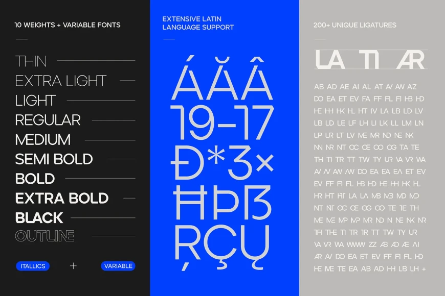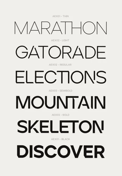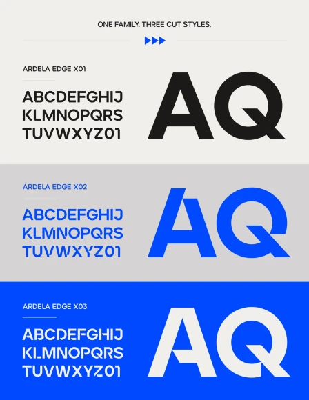 Ardela Edge, from Ellen Luff Type Foundry, is a stylized geometric sans serif family with extreme cuts, sharp angles, and multi-sensory interactive ligatures. Each of the three all-caps subfamilies has a distinct style and a different personality. The bold character breaks and considered ligatures create edgy, modern type that feels like bespoke typography. Consider it ideal for book covers, magazine headlines, and film titles.