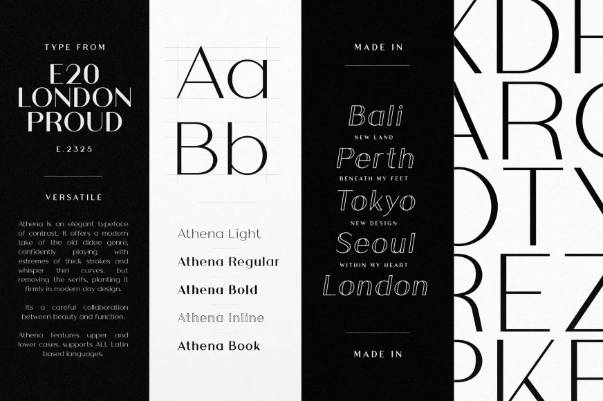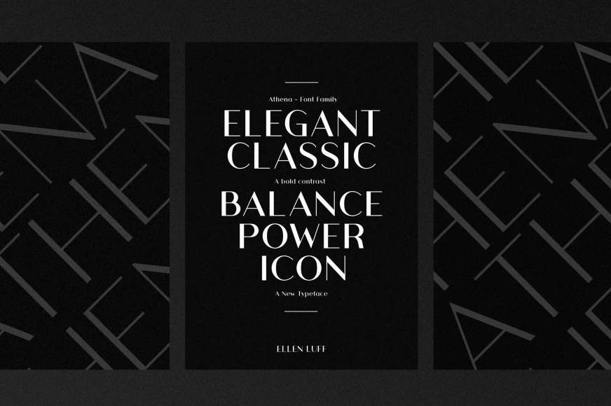 Athena, from Ellen Luff Type Foundry, is an elegant typeface of contrast. Designed for branding, headlines, and titles. The family offers class and clarity at larger and smaller sizes. It’s a modern, serifless take on the old Didone genre. A careful collaboration between beauty and function while confidently playing with extremes of thick strokes and whisper-thin curves. Athens Light, Regular, Bold, and inline are designed specifically for headlines, titles, and branding. Athens Book is optically designed for use in smaller sizes, making it ideal for body copy. Each font offers something different, but all are crafted to work harmoniously together.