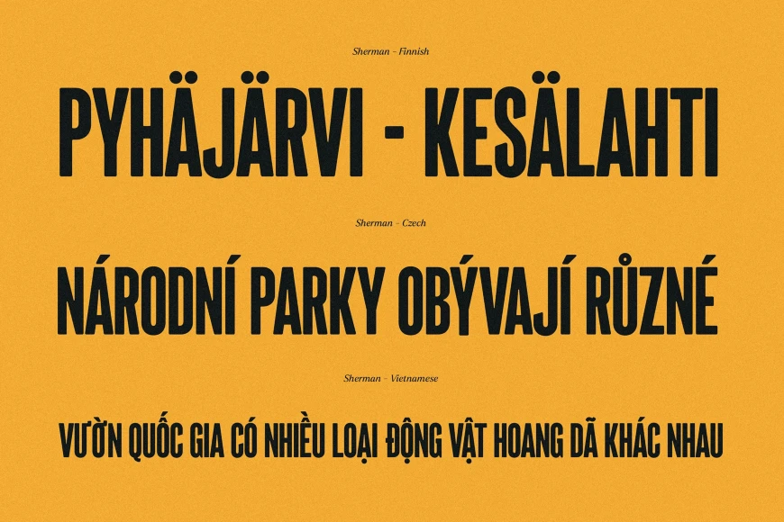 Sherman, from Ellen Luff Type Foundry, is a soft yet assertive, condensed sans serif — a gentle giant in the world of typefaces. Drawn to give headlines a confident and imposing base, while still feeling warm and friendly. It brings its own personality to the world of tall typefaces, with sleek, slanted terminals and optical adjustments to balance the big away from the heavy. It’s an all-caps font with rounded ink traps and softened edges, performing best at large sizes. Print or pixels, it’s a strong choice for headlines, titles, signage, branding, and designs that require an eye-grabbing impact.