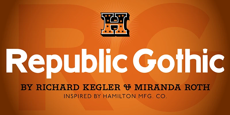 Originally issued in six sizes as one of the last Hamilton Manufacturing Co. wood types, the digital HWT Republic Gothic is now a single-style affair. Miranda Roth and Richard Kegler based their design on the extended width, creating solid and outline versions. They can be used separately or overlayed to create color effects. The playful nature of Republic Gothic, with its handful of quirky characters, will add levity to any design, making it a lively alternative to every day sans serifs.