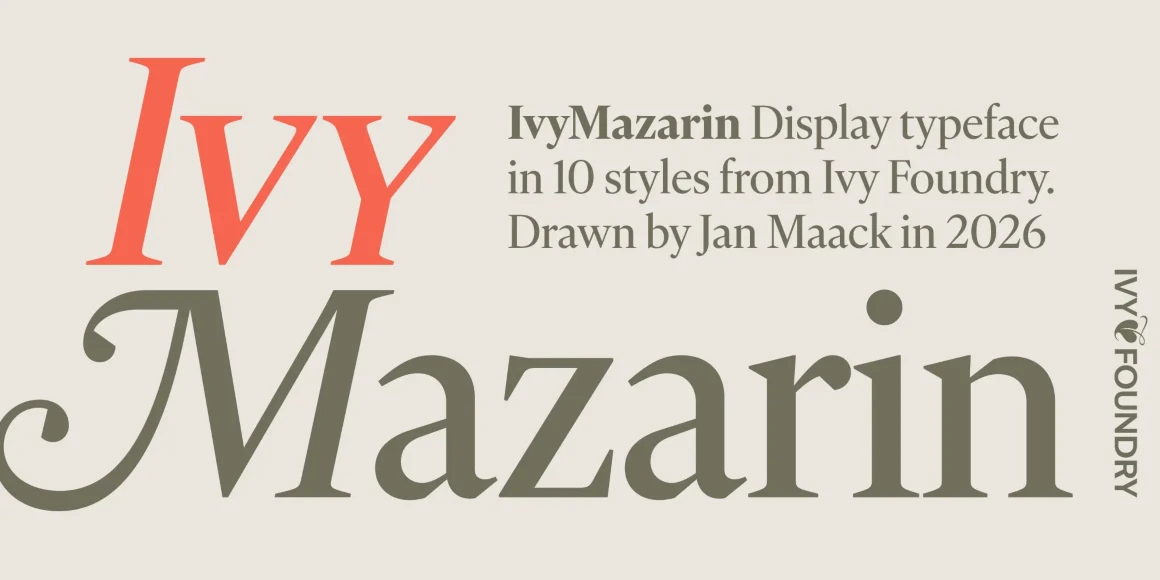 IvyMazarin is a 2026 revival of Robert Girard’s 1921 Astrée — later issued as Mazarin by Stephenson Blake in 1926 — and a French 1920s interpretation of Garamond: elegant, sharp, and quietly distinctive. Working from rare archival specimens, Jan Maack preserves the original’s cool crispness — especially in the Italics — while refining proportions, raising the x-height, moderating ascenders, and setting a confident 12° slant. Historical quirks remain available as features, including a long-legged R, alternate Q, swashes, and small caps. IvyMazarin is made for branding, editorial design, and book typography calling for refined character and a precise, incisive edge. Available in five weights with matching Italics and a broad glyph set.