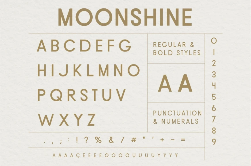 Moonshine is an all-caps geometric sans serif font family with a commanding presence. It’s a classic, clean, and versatile typeface inspired by my hometown. Created with readability in mind, it is excellent for headlines and body text. Ideal for branding, invitations, logos, posters, book covers, magazines, or any project that requires typographic distinction.