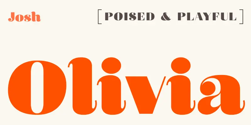 Olivia is a curvaceous display typeface, almost like a casual Bodoni. Create bold, beautiful graphics and gorgeous headlines with a vintage feel. Olivia’s contrasting strokes, wide curves, large x-height, and short tails give your designs personality and a touch of elegance. This unique versatility makes Olivia perfect for logos, wedding invitations, quotes, branding, book covers, and editorials. Olivia’s aesthetic elevates your projects with repeatedly eye-catching whimsy.