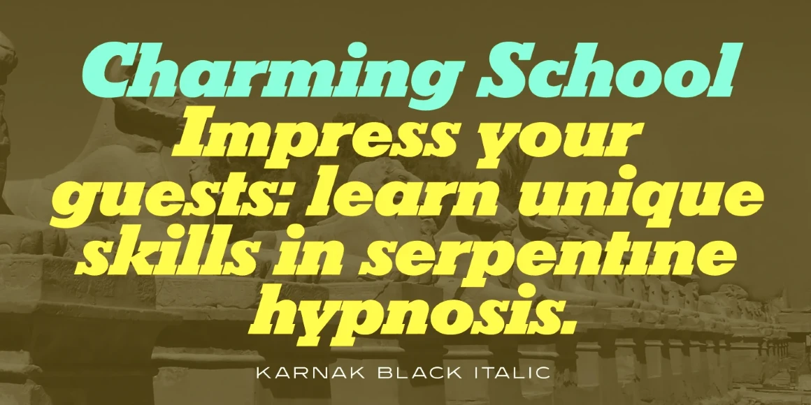 Karnak is an Egyptian font family containing roman, italic, and condensed weights, and is exclusively licensed from the Ludlow Collection by International TypeFounders. The original family was designed by Robert H. Middleton in 1931-1942, and the new versions were produced by Steve Jackaman (ITF) and Ashley Muir in 2009. A bold weight was added, and the italics underwent a complete re-design. Karnak has optimal spacing for excellent legibility at all sizes, and has a western or academic feel.