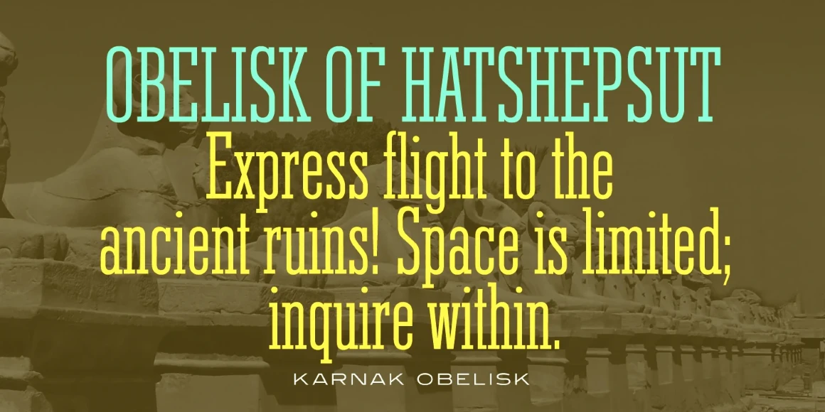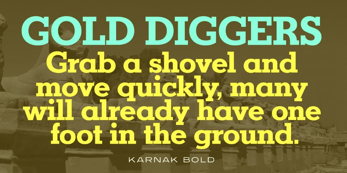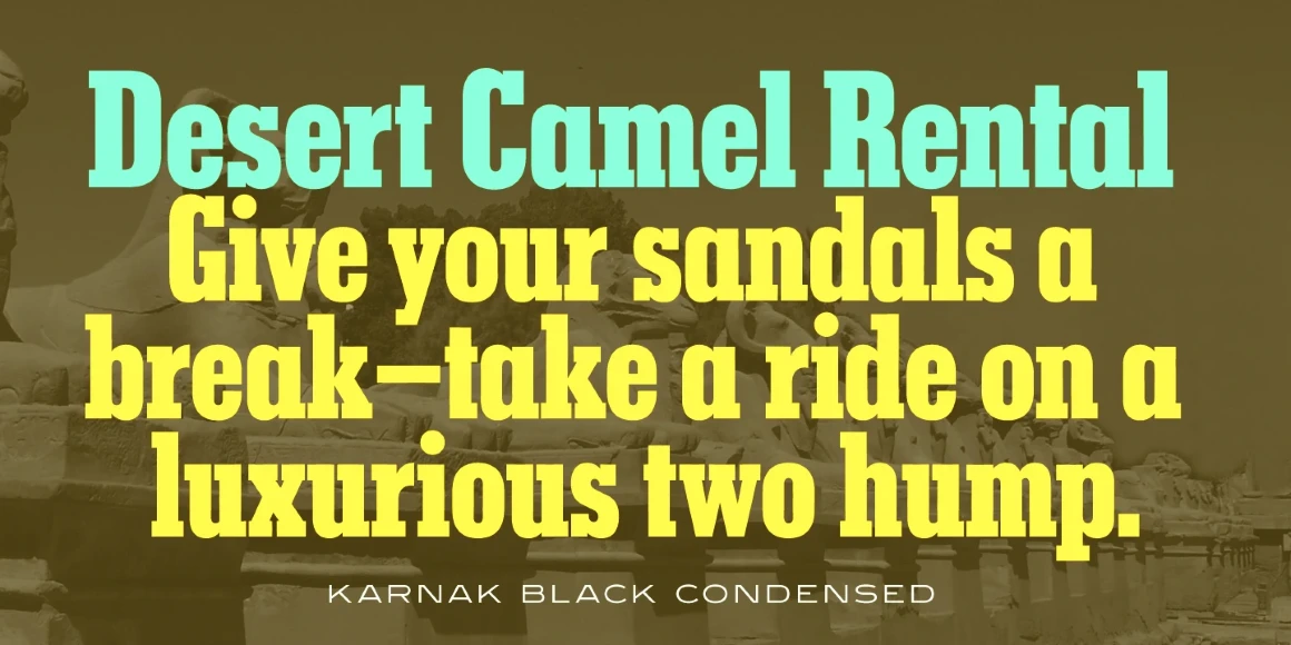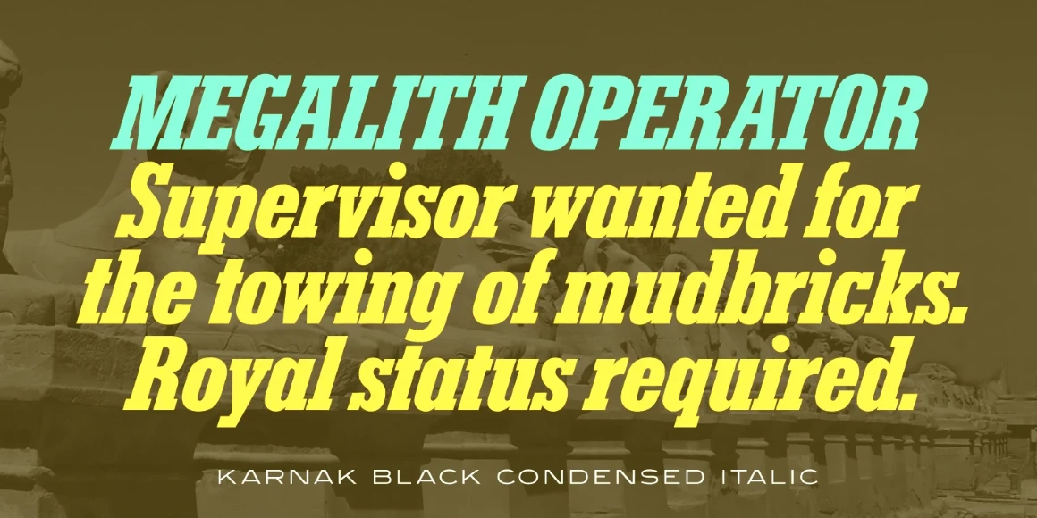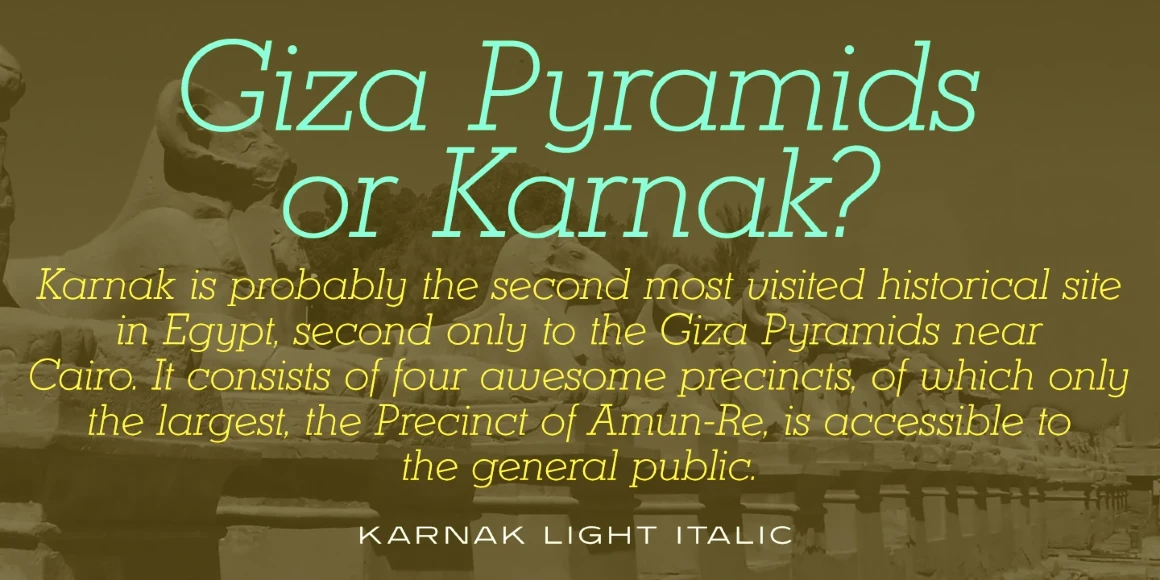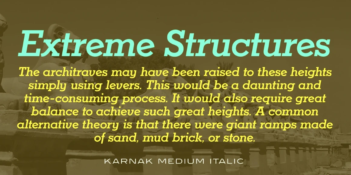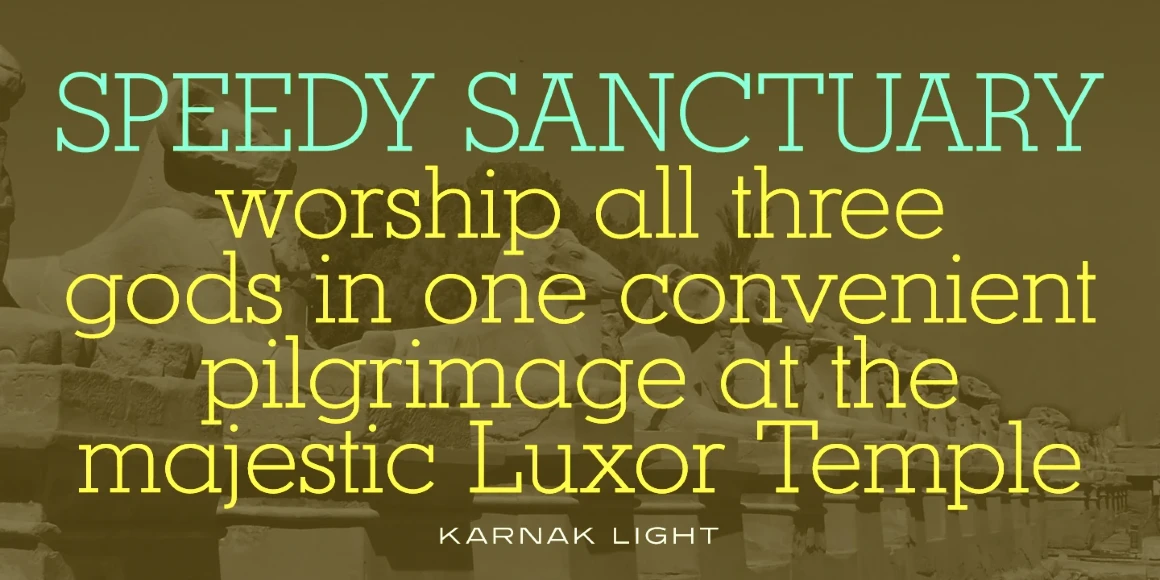 Karnak is an Egyptian font family containing roman, italic, and condensed weights, and is exclusively licensed from the Ludlow Collection by International TypeFounders. The original family was designed by Robert H. Middleton in 1931-1942, and the new versions were produced by Steve Jackaman (ITF) and Ashley Muir in 2009. A bold weight was added, and the italics underwent a complete re-design. Karnak has optimal spacing for excellent legibility at all sizes, and has a western or academic feel.