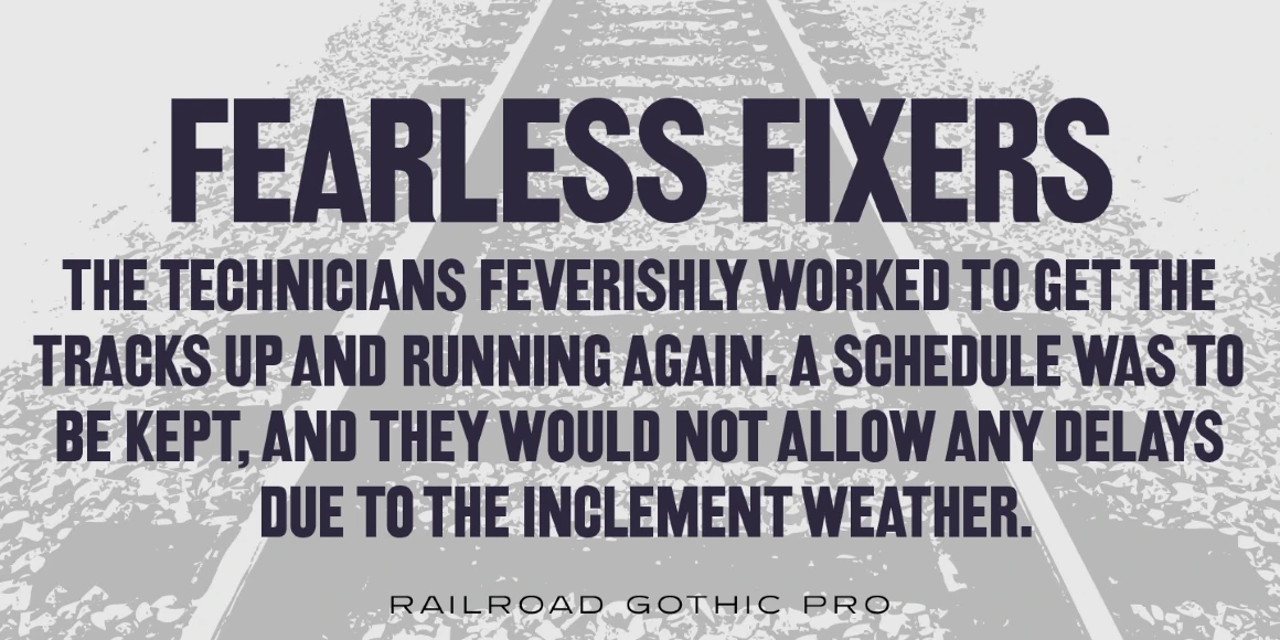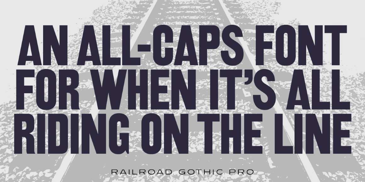 Railroad Gothic is a condensed, sans serif typeface, exclusively licensed from the Ludlow Collection. The original Railroad Gothic was produced by Ludlow in the early 1900’s, and Steve Jackaman (ITF) produced the digital version in 2017. The font provides support for Latin 1, Central, and Eastern European languages, and Cyrillic. Railroad Gothic is reminiscent of typefaces used in 1900’s railyards, hence the name.