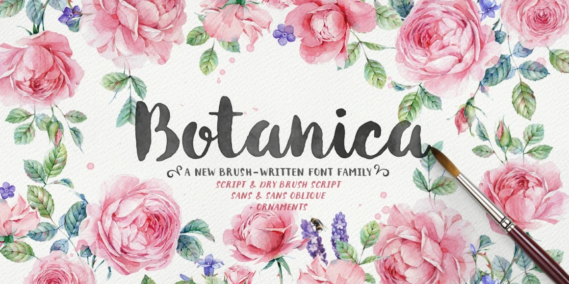 Botanica is a 100% brush-written font family with an inky texture inspired by modern brush lettering and design trends. The fonts were designed to look good together or separately, and possibilities are only limited by your imagination. With two types of initial and terminal swashes, the Script font is a good companion in wedding invitation design.