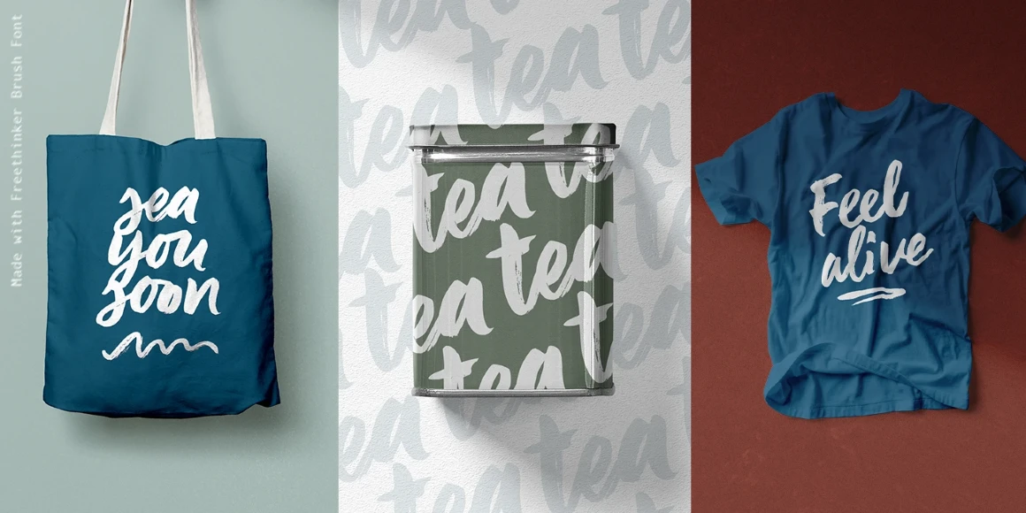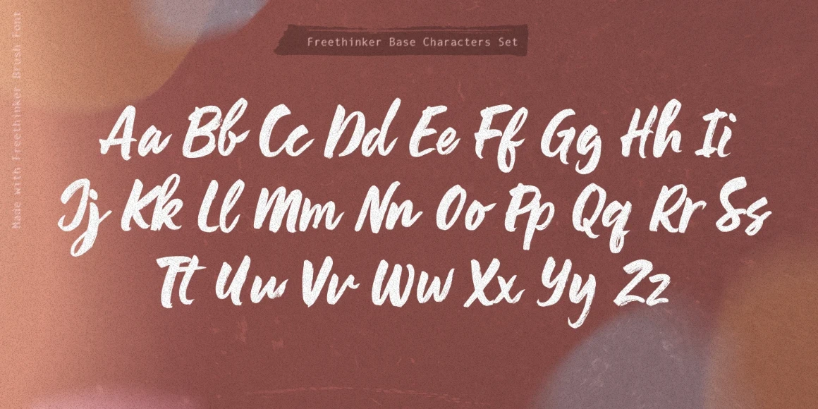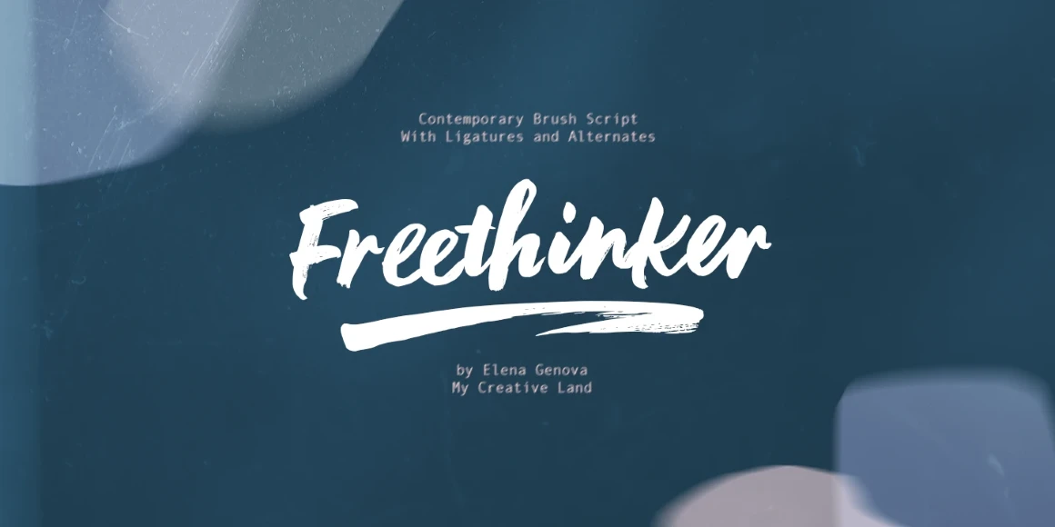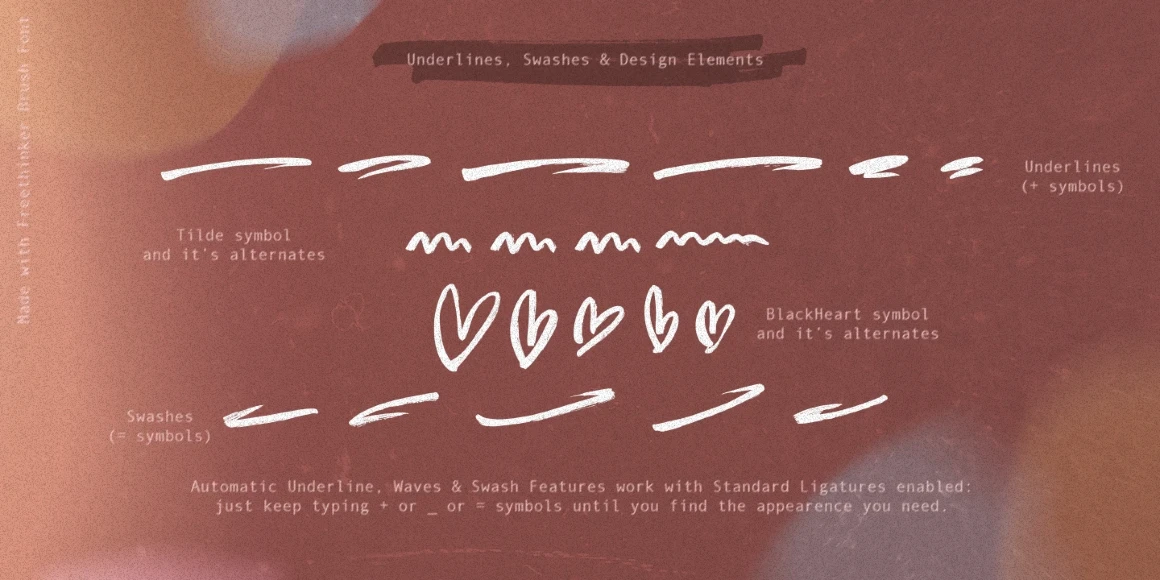 Freethinker is a casually irregular brush script. Depending on how it is used, it can give a sense of urgency or something more casual or informal. The designer using this typeface will benefit from the ligatures and stylistic alternates, allowing for a more authentic hand-lettered feel through their use and application. Freethinker is perfect for branding, greeting cards, packaging design, web design, and publication design. Don’t miss the design elements to add even more embellishment!