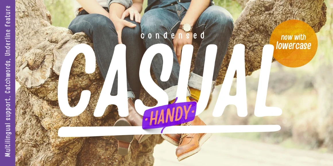 Handy Casual Condensed is an informal brush-written sans inspired by hand lettering found in the poster of the 1960s. Perfect for playing the lead or supporting role on billboards, posters, signage, magazines and books, packaging, and greeting cards. Handy Casual Condensed combines unique character with tons of features, including ligatures, catchwords, stylistic alternates, and an underline feature.