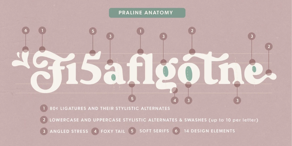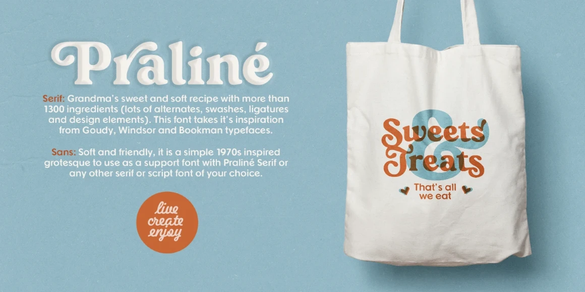 Praline is a font family that contains two fonts — the perfect pairing — a vintage soft serif and a sans serif with corresponding forms and softness. Serif: Grandma’s sweet and soft recipe with more than 1300 ingredients (lots of alternates, swashes, ligatures, and design elements). This font takes its inspiration from Goudy, Windsor, and Bookman typefaces. Sans serif: Soft and friendly, it is a simple 1970s-inspired grotesque to use as a support font with Praliné Serif or any other serif or script font of your choice. Get your designs to look like the 1970s!