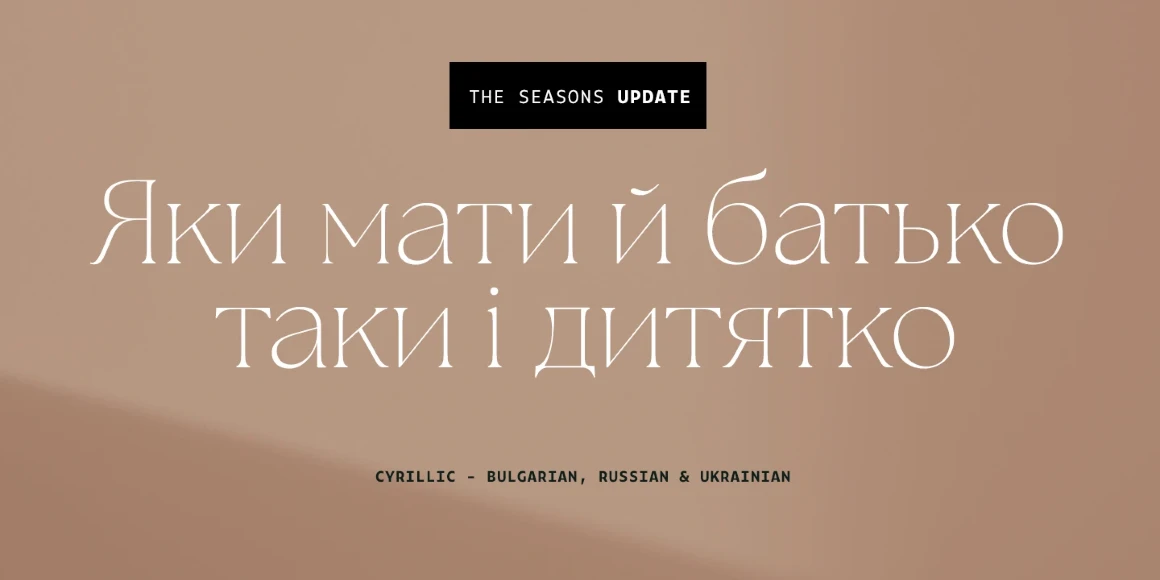The Seasons is an elegant serif family with a strikingly chic look. The companion calligraphic italics are based on humanistic scripts and written using a Pilot Parallel Pen. The design is further enhanced with ligatures and stylistic alternates. All weights — Thin to ExtraBold — share the same style of softly sheared terminals and sharply dramatic curves, making them perfect for branding, logos, magazines, product packaging, and invitations. Language support includes Extended Latin and Cyrillic.