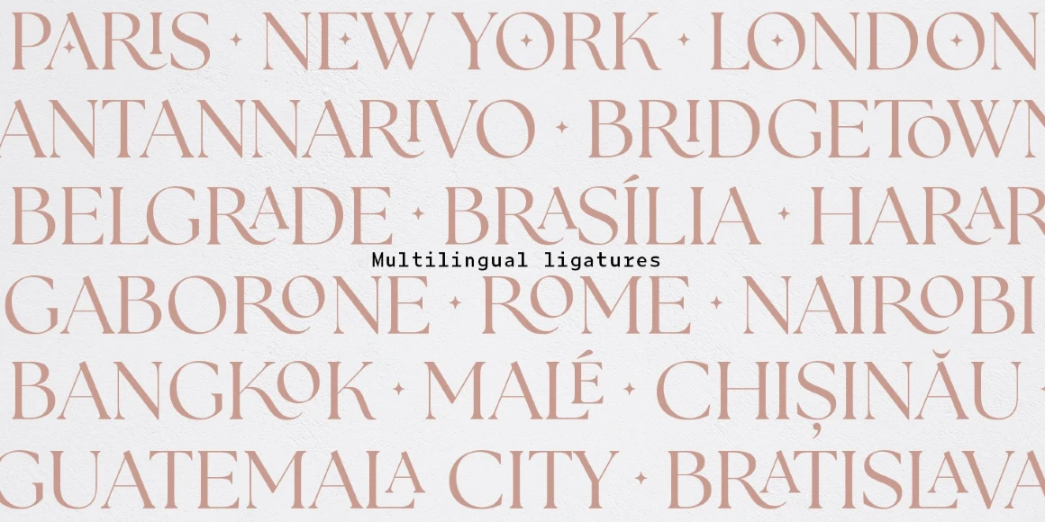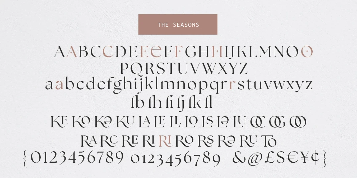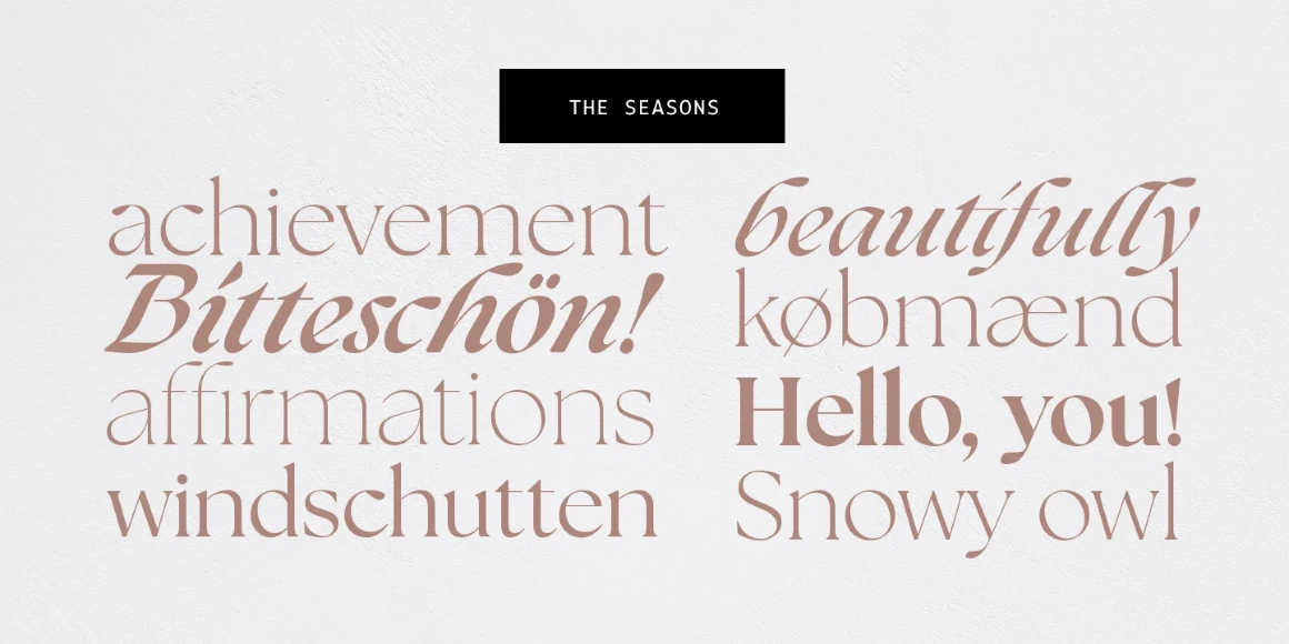 The Seasons is an elegant serif family with a strikingly chic look. The companion calligraphic italics are based on humanistic scripts and written using a Pilot Parallel Pen. The design is further enhanced with ligatures and stylistic alternates. All weights — Thin to ExtraBold — share the same style of softly sheared terminals and sharply dramatic curves, making them perfect for branding, logos, magazines, product packaging, and invitations. Language support includes Extended Latin and Cyrillic.