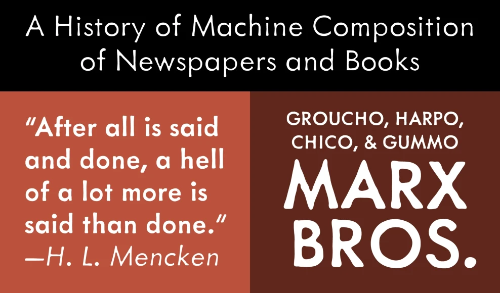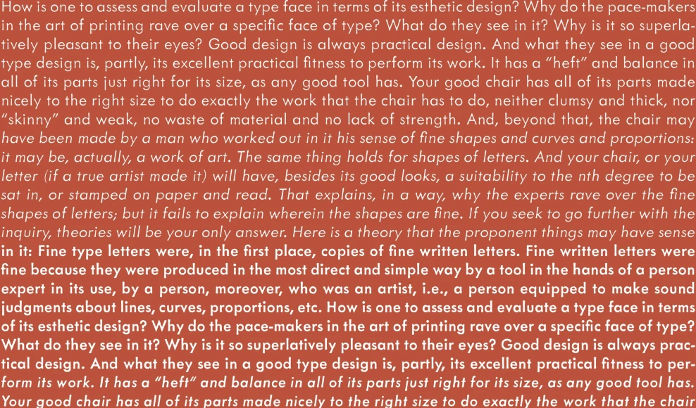 Metallophile Sp8 (2003, 2008) is a facsimile of 8-point sans serif type as set on a hot metal typesetting machine. The effect is very different from modern digital renditions of its cousin, Futura, which are coldly precise in and look quite different at text sizes. Hot metal faces were designed for specific point sizes, while modern digital faces take a one-font-for-all-sizes approach. Metallophile Sp8 captures much of the characteristic warmth of hot metal, which is particularly refreshing in such a geometric design.