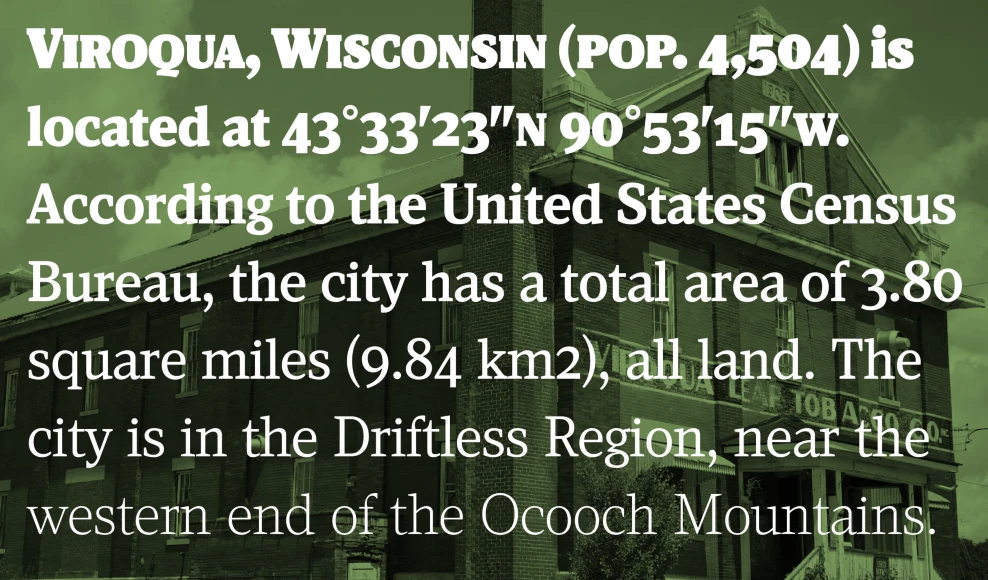 Viroqua is a redesign of Kandal (1994), one of my first typefaces, after 30 years more practice at type design. It’s a hybrid, combining old style details with modern proportions. It has fairly low contrast, with wedge-shaped slab serifs. Viroqua is very comfortable to read in text, and the boldest weights provide a lot of impact at display sizes. Viroqua features small caps, old style and lining figures (both proportional and tabular), superscript and subscript figures, fractions, and dingbats.