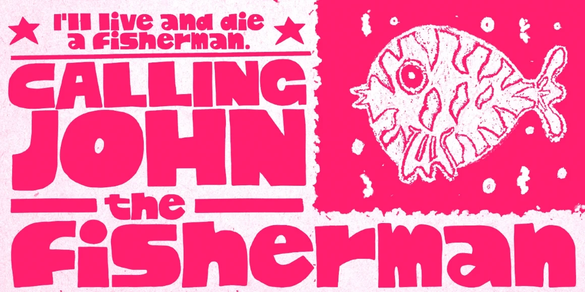 Cachalote is a positively bold display face drawn by subtracting negative space. Its exaggerated proportions and tight spacing give it an almost animated feel, evoking a whimsical, cartoonish tone. Ideal for children’s titles, toy packaging, retro posters, or playful branding where personality and visual impact are key.