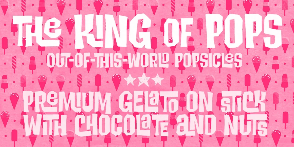 Manihot is a cool, loud, high-impact display font inspired by the film posters of Italian artist Symeoni from the 1960s and 1970s. It combines assertive forms — Clean and Rough — with a cut-and-paste texture for a lively, screen-printed feel. Each letter comes with an alternate, allowing for creative variation within words. Also includes a handy set of dingbats! Perfect for impossible-to-ignore magazines, posters, book covers, and expressive branding. Give it a go!