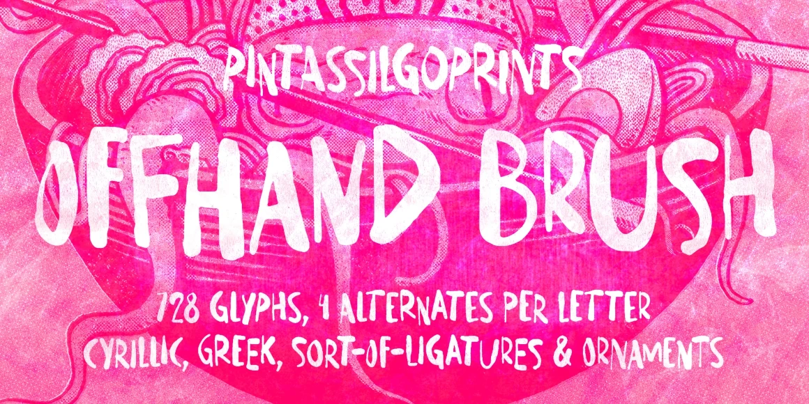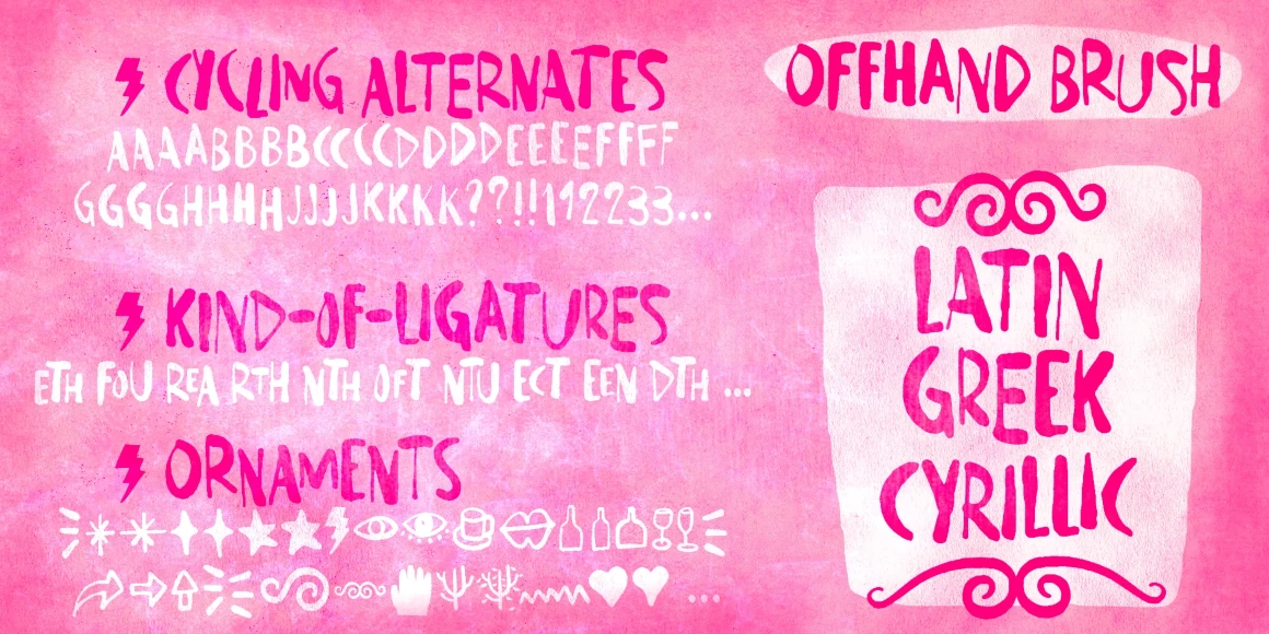 Offhand Brush is a fast, spontaneous brush font with a slightly messy feel. It’s an excellent option for book covers, packaging projects, album art, web titles, and even small chunks of text. You might see something a little messy, but it was laborious work, with four alternates for each Latin letter, two for numerals, and two options for Cyrillic and Greek letters to add liveliness and energy. Hey, wait! There are some ornaments, too. Hell yes! Use it big!
