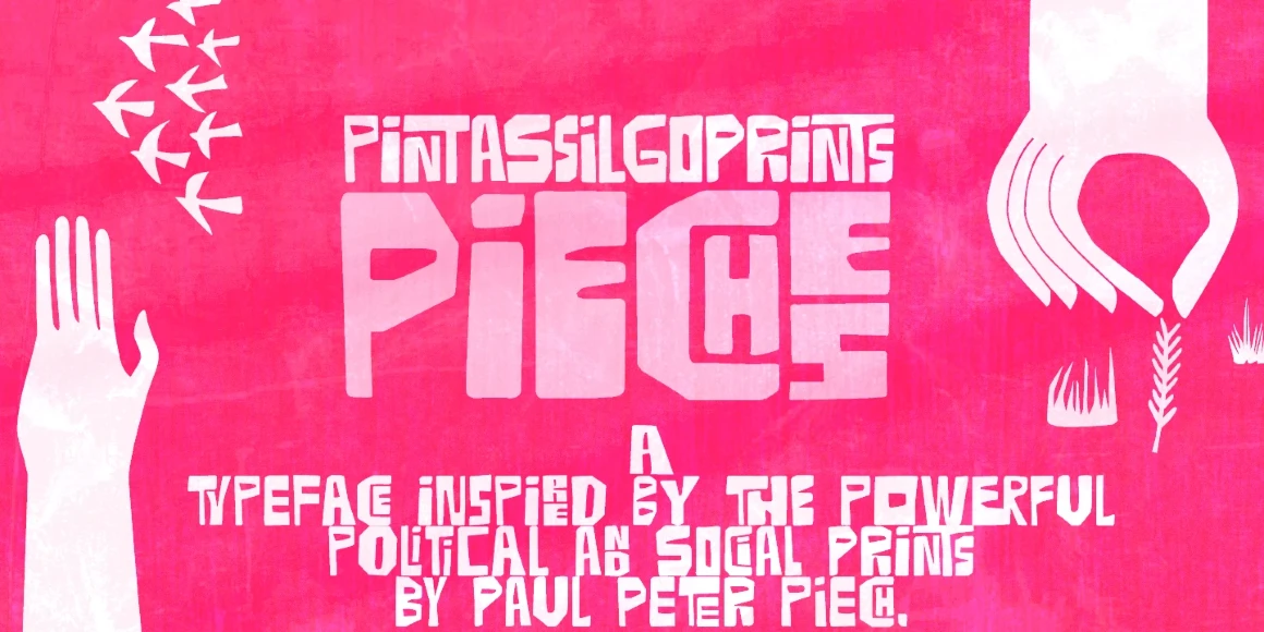 Pieches is a linocut-looking all-caps font inspired by the powerful political and social posters designed by artist and printer Paul Peter Piech. Questioned about his endless focus on work, he once said, “I don’t want to sit around and be silent.” With the bonus of interlock letterforms, designers can create countless expressive possibilities. This is a loud-speaking font for those who don’t want to be silent. Ideal for adding a gritty, handcrafted energy to posters, zines, and album covers.