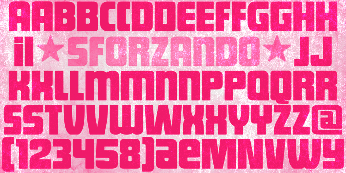 Sforzando is a strikingly bold and modern display sans serif font family. It comes with a small but handy set of alternates that help create an original and unusual touch, amplifying your design choices. Vigorous and versatile, its compact letterforms and tight spacing pack a visual punch. Sforzando is an excellent choice for a wide range of applications, including concert posters, editorial layouts, film titles, book covers, food packaging, and any situation where attention is non-negotiable!