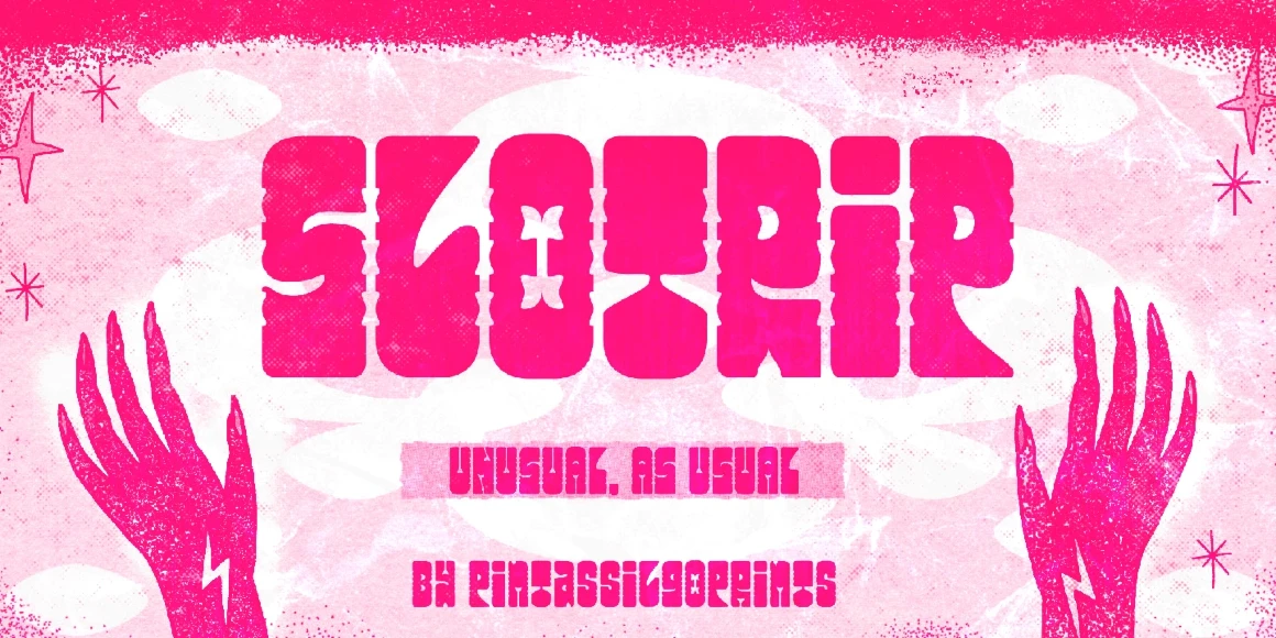 Slotrip is a boldly original and highly decorative unicase typeface design. The family has 2 styles, and both have a handy set of alternates. It sits somewhere in between the groovy vibe of the 1960s and something monumental or carved in stone. Suitable for creative and eye-catching display uses, such as movie posters, science fiction book covers, toy packaging, and graphic t-shirts, among others. Whatever the use, it won’t go unnoticed!