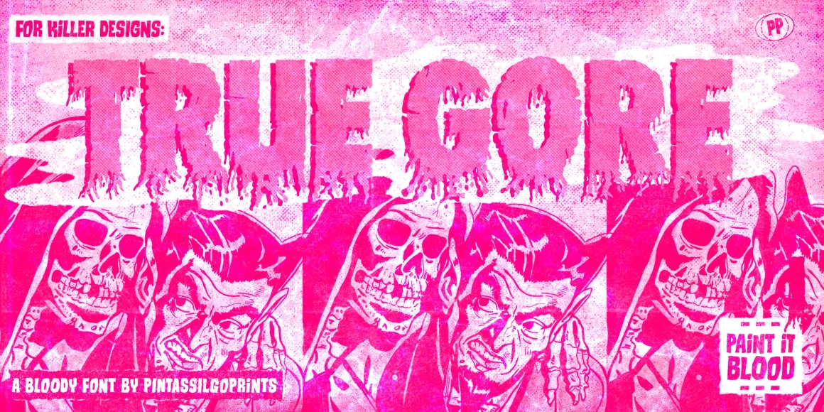 True Gore is a bloody, all-caps display sans. It’s a horrific pick for your dreadfully wicked designs. Do you want to imply vintage horror, retro space travel, or simple disgust? This font is perfect for so many different projects! Book and album covers, packaging, t-shirts, apparel, and Halloween imagery, to name a few. There are two alternates for each letter and numeral, adding a touch of originality. Do you like the perfect complementary font shown in the posters? Try Runcible, also by PintassilgoPrints.
