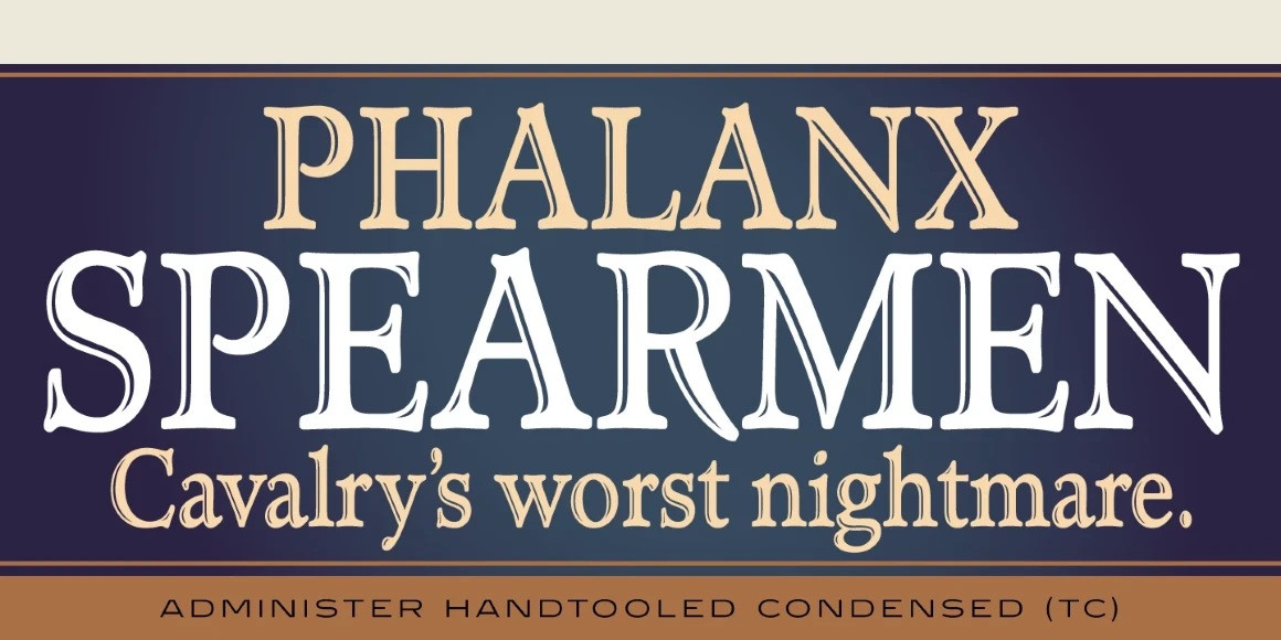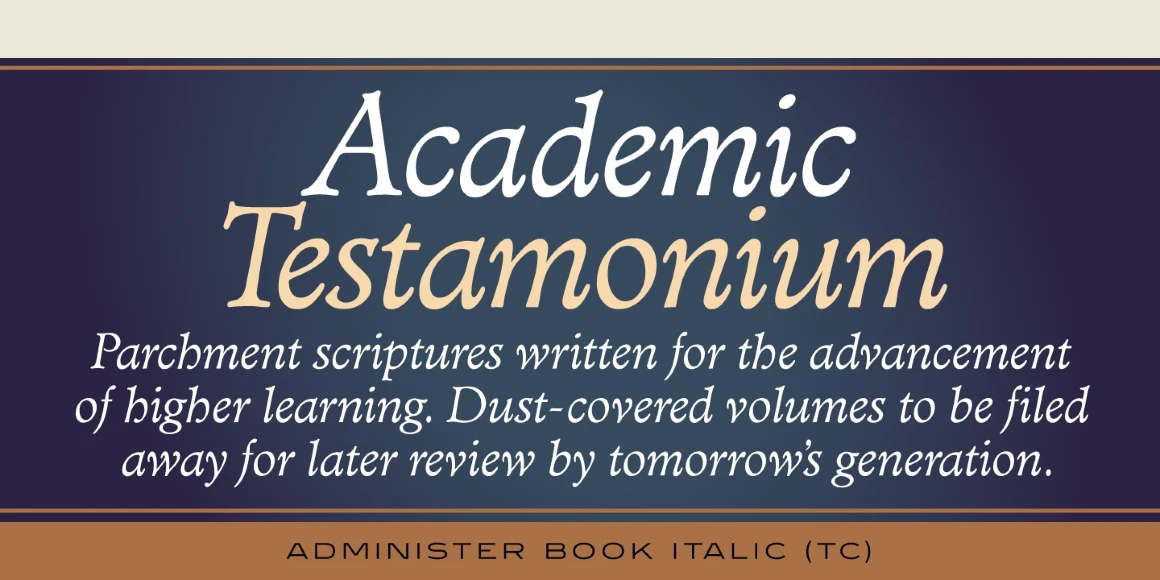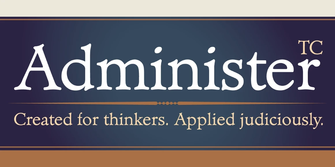 Administer TC is a Roman/Venetian-style serif font family with wide capitals. It was inspired by a typeface called ‘Minister,’ which was designed by M. Fahrenwaldt for Schriftguss, circa 1929. Les Usherwood (Typsettra) created Administer in the early 1980’s, and Steve Jackaman (ITF) refined the family for its digital release in 1994. The Light, Book, and italic weights of Administer are distinct at paragraph size, and the heavier and hand-tooled weights showcase the family’s authoritative feel in display size.