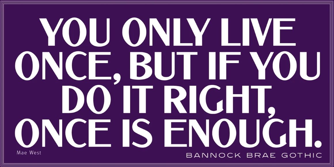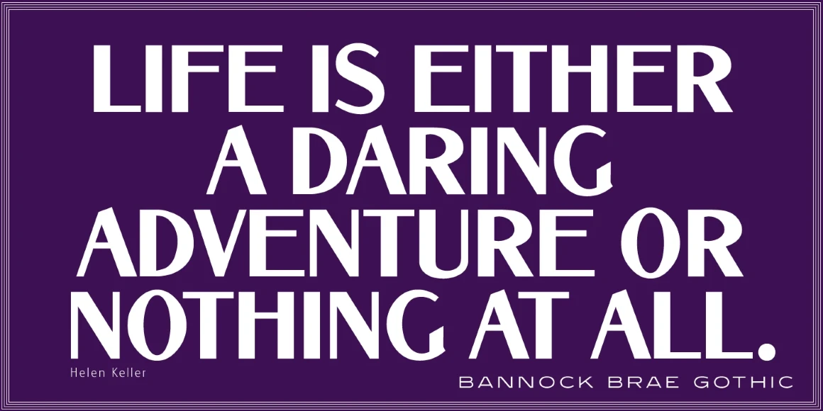 Bannock Brae Gothic is a sans serif typeface. It is an original creation of Steve Jackaman (ITF) and was created for the Red Rooster Collection in 1999. The typeface was loosely inspired by a typeface from an old obscure wood type specimen book from the turn of the 20th century. Due to its turn-of-the-century roots, Bannock Brae Gothic has an informal 1920’s art deco look. It finds an ideal home in lighthearted projects concerning crafts, food, festivals, and music, but its alternates still give it the flexibility to showcase a classic and timeless feel in any project.