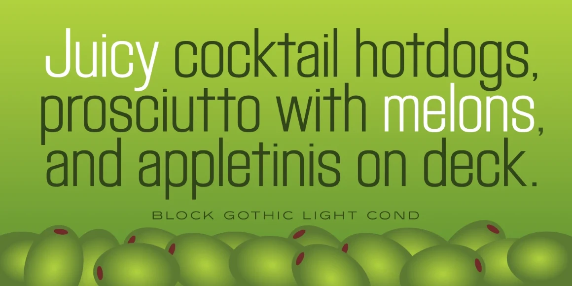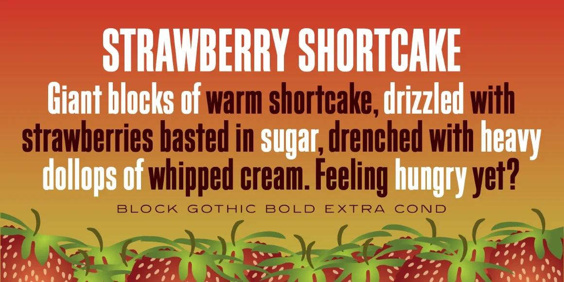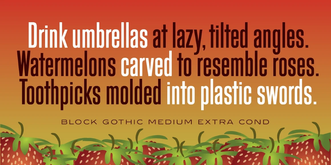 Block Gothic Extra Condensed is a sans serif font family exclusively licensed from the Techni-Process (TP) Collection. Steve Jackaman (ITF) redrew and produced the family in 1994. Block Gothic Extra Condensed has a fashionable modern feel, and is quite sturdy in its heavier weights. The family clean and legible in all sizes, and adds a unique beauty to projects. Its sister family, Block Gothic Condensed, is a great alternative for those seeking an uncompressed version of the family.