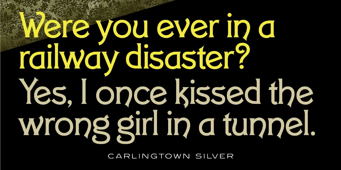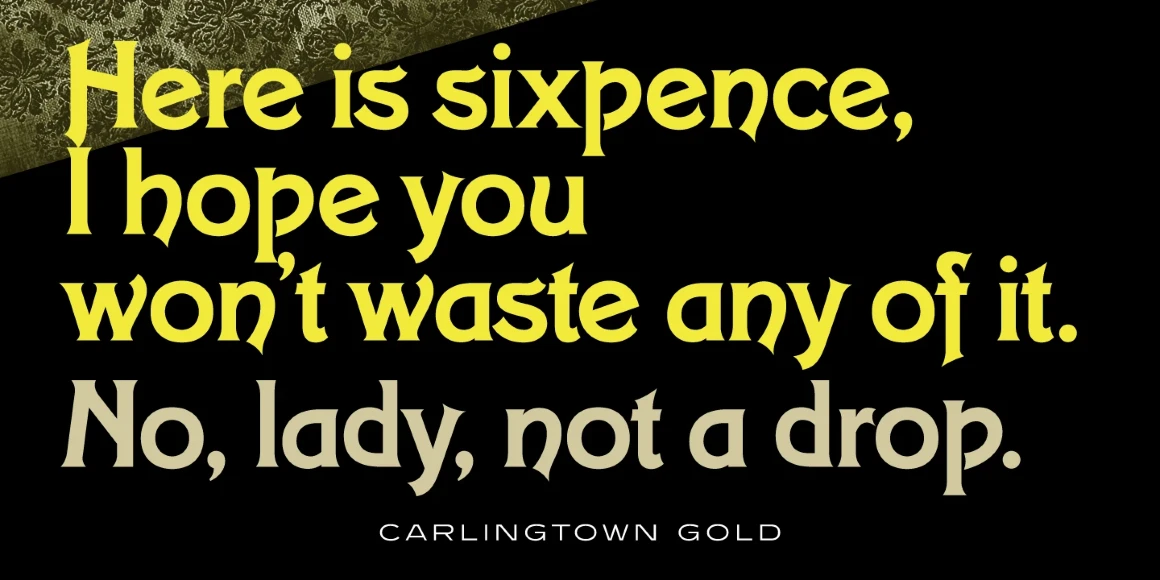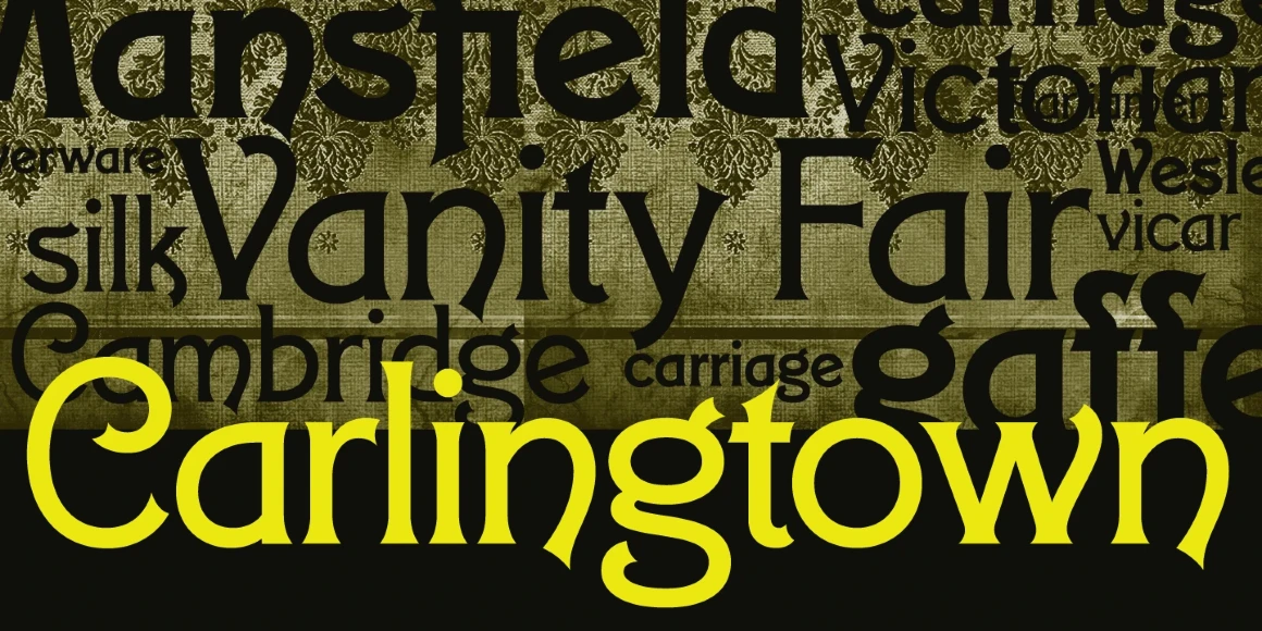Carlingtown is a decorative serif font family. It was created and produced by Steve Jackaman (ITF) and Ashley Muir in 2009, and was originally known as the typeface ‘Constantia.’ At the time of publication ‘Constantia’ was already in use, so Jackaman decided to give this Victorian font family the new name ‘Carlingtown.’ Carlingtown has a Victorian, Art Deco, or elegant vaudeville feel. The family is quite flexible in its application, and works in everything from small paragraph size to an all-caps display size.