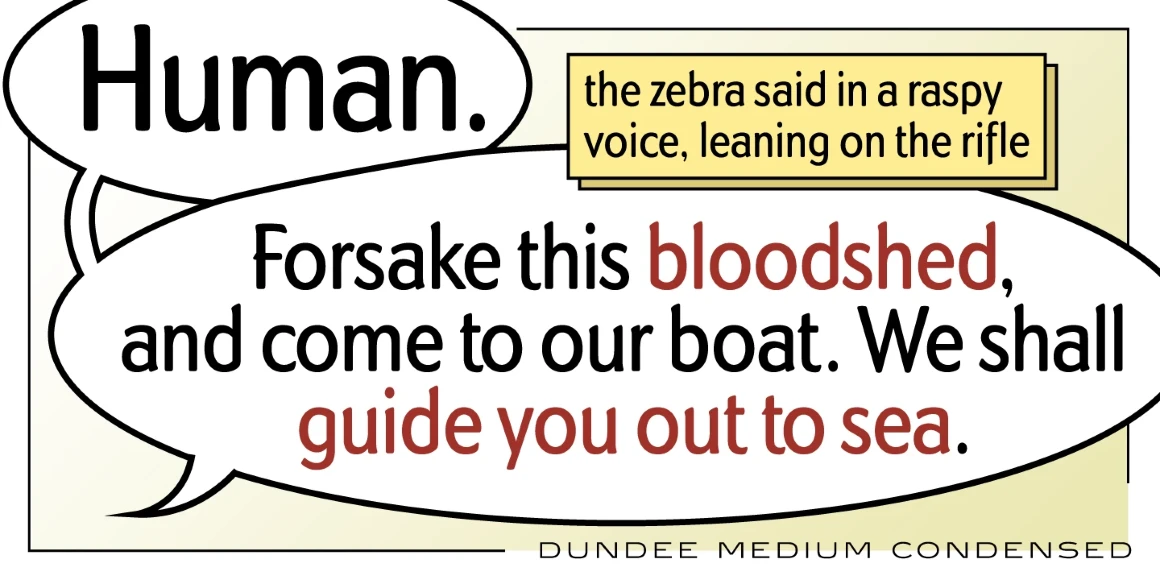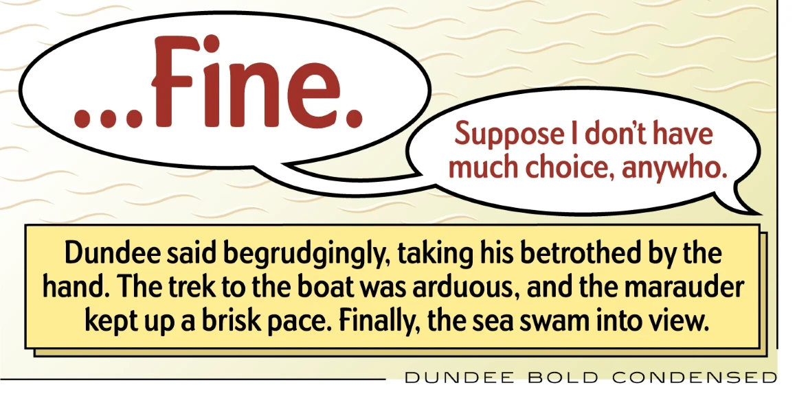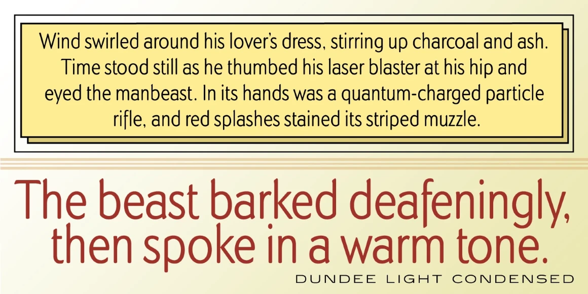 Dundee is a unique glyphic face, in that it can be interpreted as both a serif and sans serif font family. Its digital letterforms were manufactured by Pat Hickson (P&P Hickson) exclusively for the Red Rooster Collection, and its full commercial version was produced by Steve Jackaman (ITF) in 1993. The design of Dundee was inspired by the various mastheads used in children’s comic books in the United Kingdom, which were published by D.C. Thomson of Dundee, Scotland. Dundee is dexterous enough to be successful in both serious and fun projects.