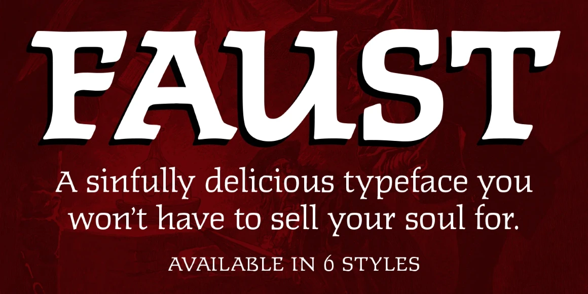 Faust is a soft-serif font family created by Steve Jackaman (ITF) in 1993 exclusively for the Red Rooster Collection. It was inspired by “Faust Antiqua,” which was designed by German designer Albert Kapr for Typoart in 1959. “Faust Antiqua’s” original design only included a roman and italic weight; Jackaman built four additional weights to flesh out the family. Faust’s slightly geometric, sloped curves evoke a Victorian or Baroque look. The caps are wide and lower than the ascenders, and there is some squaring up of the round letters.