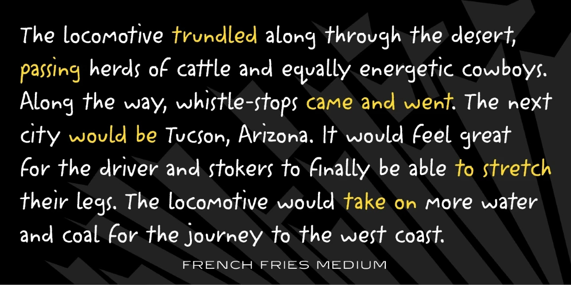 French Fries is a three-weight casual script font family. It was created and produced by Steve Jackaman (ITF) in 2017. French Fries has a casual, lighthearted, playful, hand-lettered look, and is food for the eyes at any size. The family is surprisingly versatile, and might be right at home on menus, packaging, and early education materials.