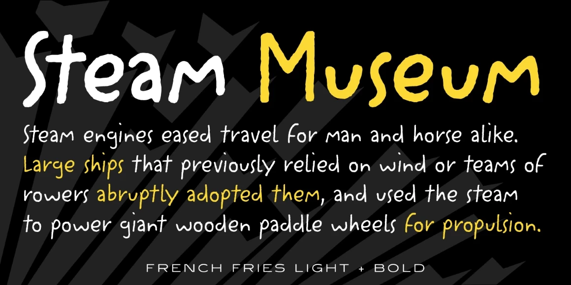 French Fries is a three-weight casual script font family. It was created and produced by Steve Jackaman (ITF) in 2017. French Fries has a casual, lighthearted, playful, hand-lettered look, and is food for the eyes at any size. The family is surprisingly versatile, and might be right at home on menus, packaging, and early education materials.