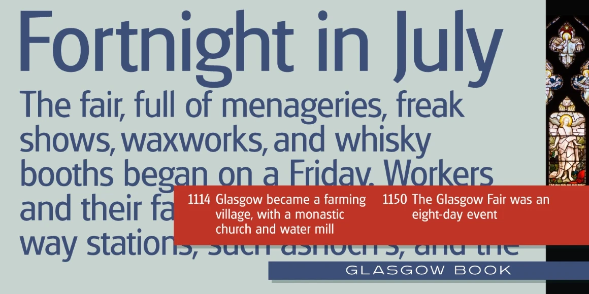 Glasgow is a humanist sans serif font family, and was exclusively licensed from the Quick Brown Fox (QBF) Collection, Germany. It was completely redrawn and produced by Steve Jackaman (ITF) and Ashley Muir in 2010. Glasgow has a modern feel, and was optimized for legibility at all sizes. Whether it be a tiny paragraph of text or a headline on a billboard, Glasgow will be sure to get your message out crystal clear.