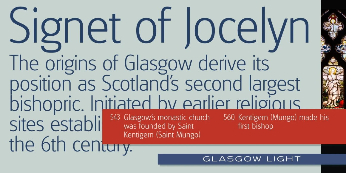 Glasgow is a humanist sans serif font family, and was exclusively licensed from the Quick Brown Fox (QBF) Collection, Germany. It was completely redrawn and produced by Steve Jackaman (ITF) and Ashley Muir in 2010. Glasgow has a modern feel, and was optimized for legibility at all sizes. Whether it be a tiny paragraph of text or a headline on a billboard, Glasgow will be sure to get your message out crystal clear.