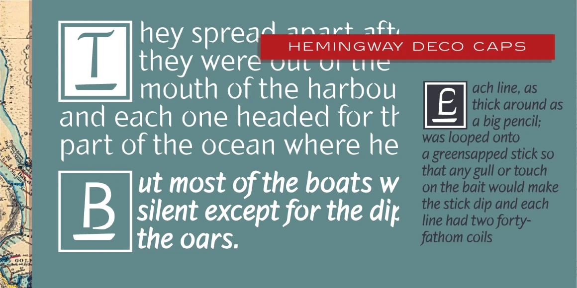 Hemingway is an eight-weight sans serif font family designed by Alessandro Segalini and digitally engineered by Steve Jackaman (ITF) exclusively for the Red Rooster Collection in 2009. Segalini was inspired by the prize-winning novel “The Old Man and the Sea” by Ernest Miller Hemingway. The typeface was designed with a visual mixture of sharpness and harshness but shows soft and gentle hints – much like the qualities of the ocean in Hemingway’s novel. Hemingway’s unique inclusion of angular and sharp terminals mixed with the calligraphic nature of its italic weights gives it an antique, worn look as if carved into wood with a knife. It is excellent for announcements, invitations, literature, and more.