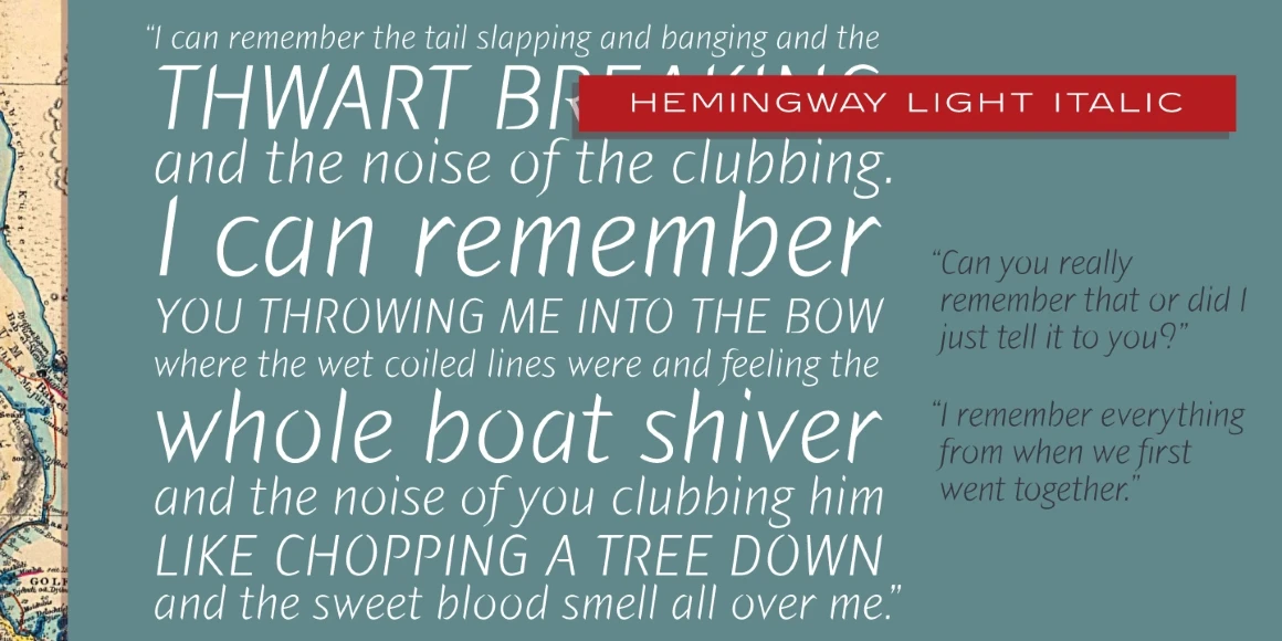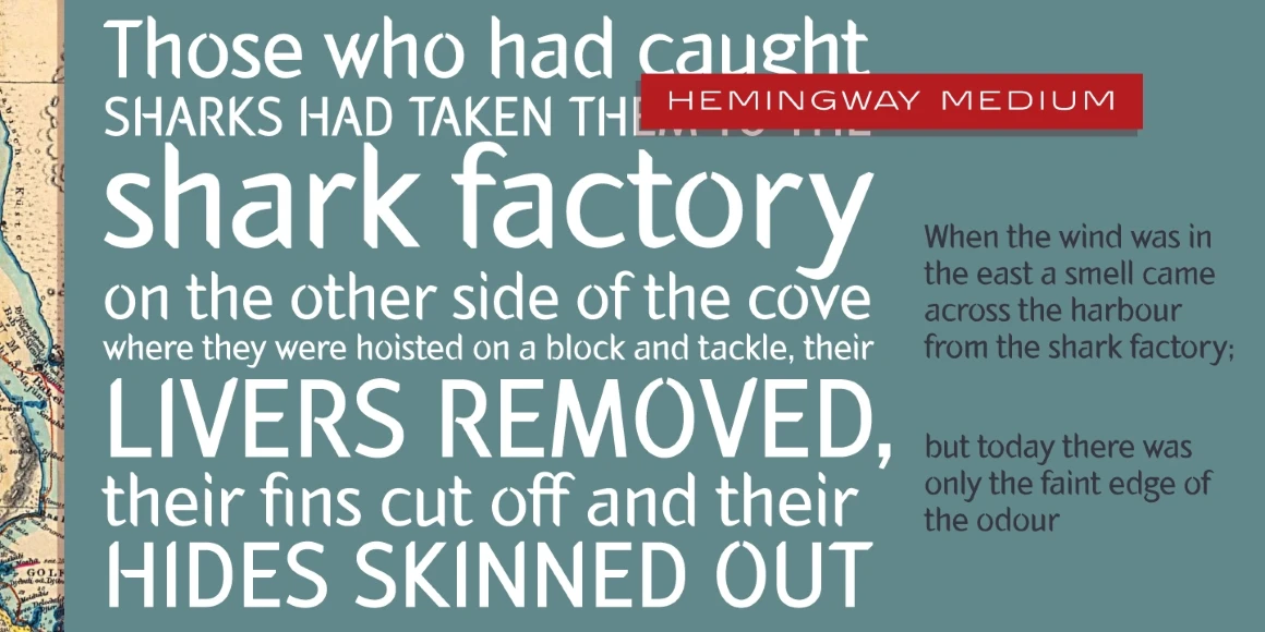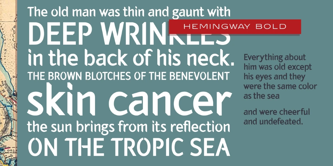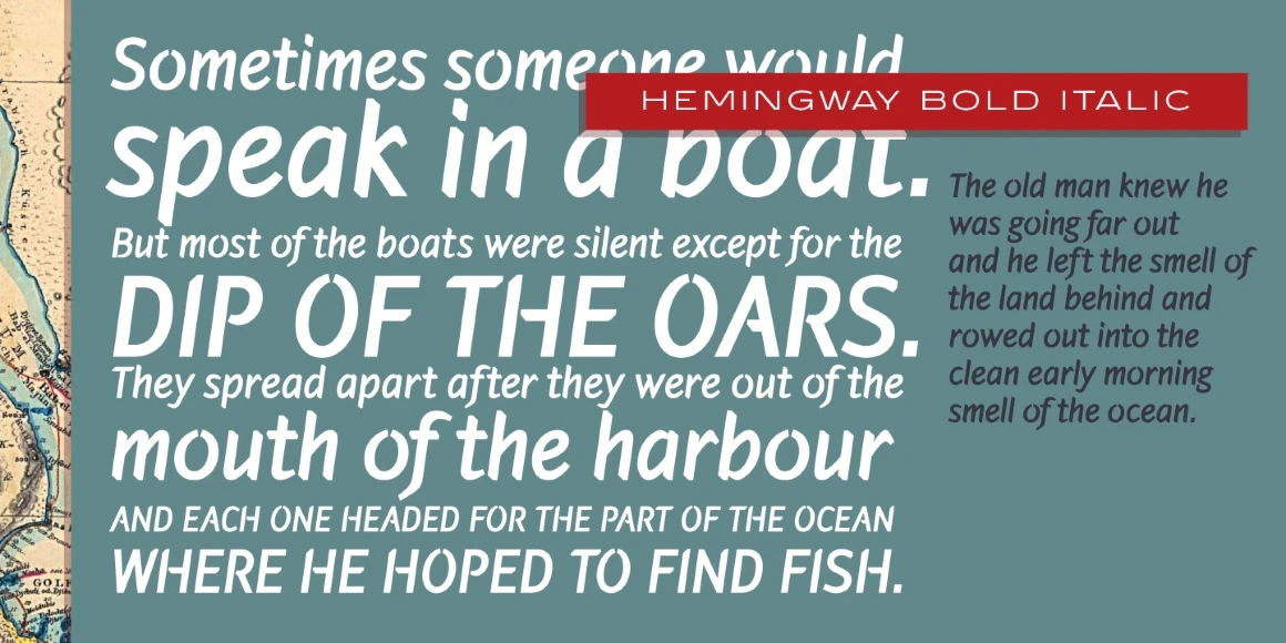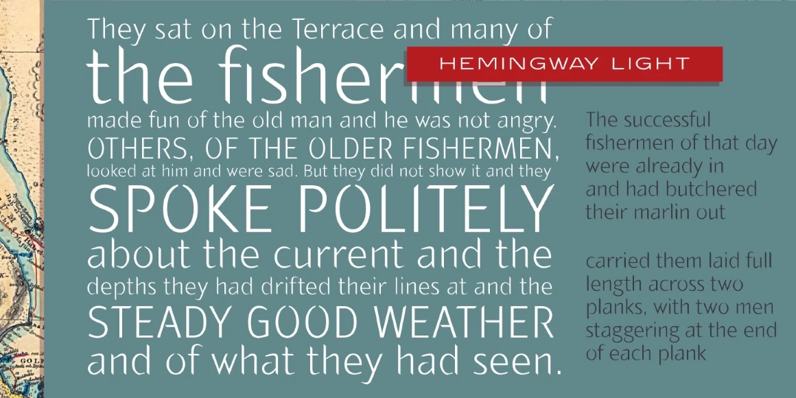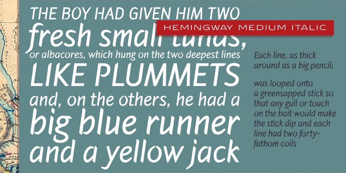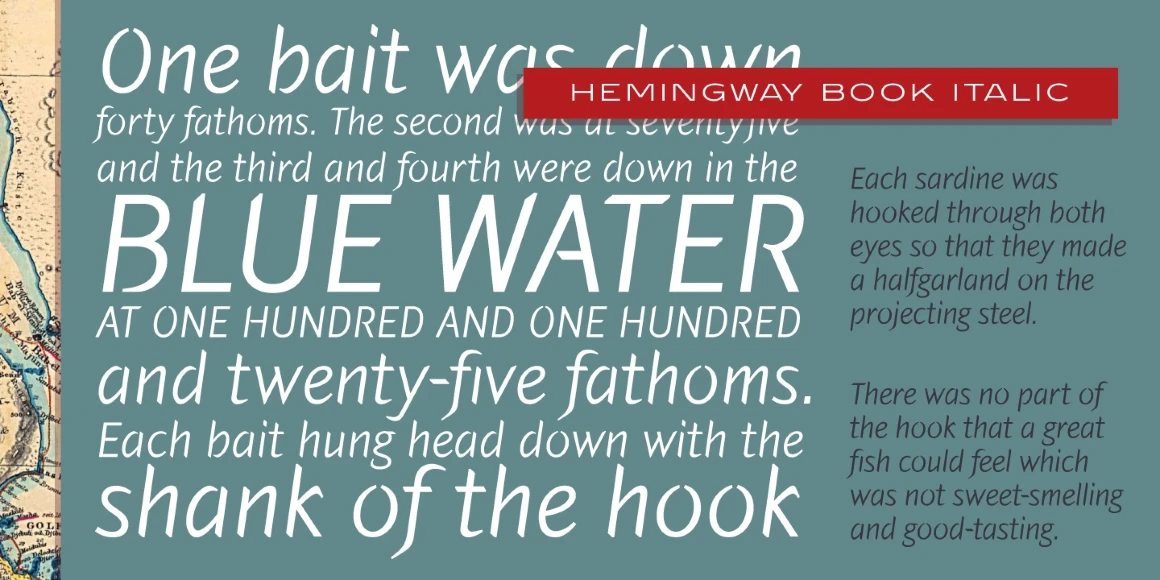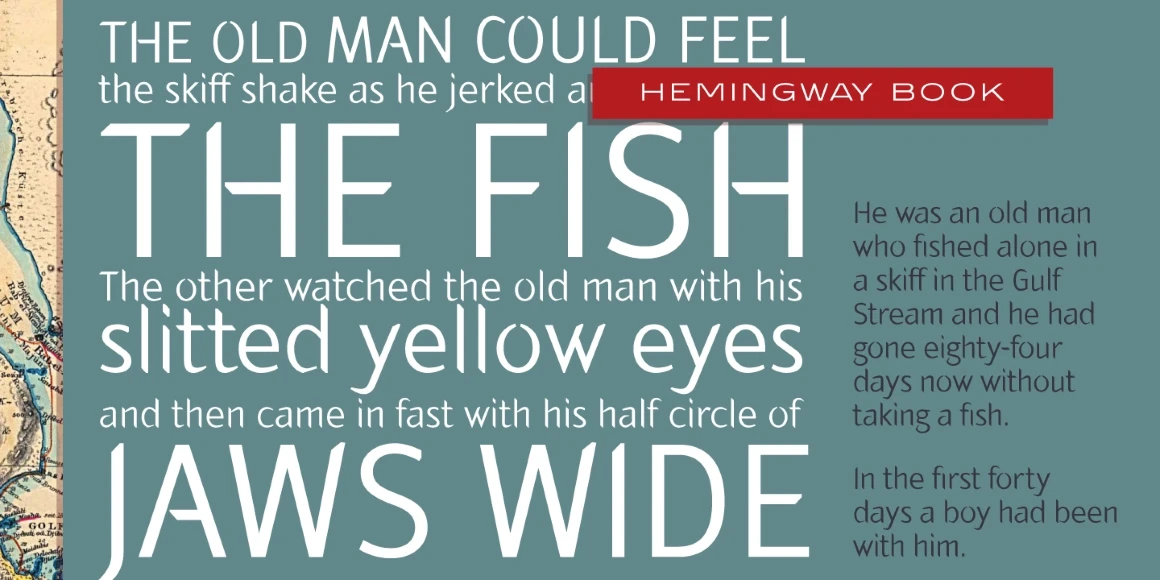 Hemingway is an eight-weight sans serif font family designed by Alessandro Segalini and digitally engineered by Steve Jackaman (ITF) exclusively for the Red Rooster Collection in 2009. Segalini was inspired by the prize-winning novel “The Old Man and the Sea” by Ernest Miller Hemingway. The typeface was designed with a visual mixture of sharpness and harshness but shows soft and gentle hints – much like the qualities of the ocean in Hemingway’s novel. Hemingway’s unique inclusion of angular and sharp terminals mixed with the calligraphic nature of its italic weights gives it an antique, worn look as if carved into wood with a knife. It is excellent for announcements, invitations, literature, and more.