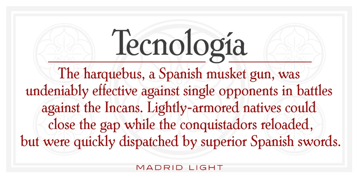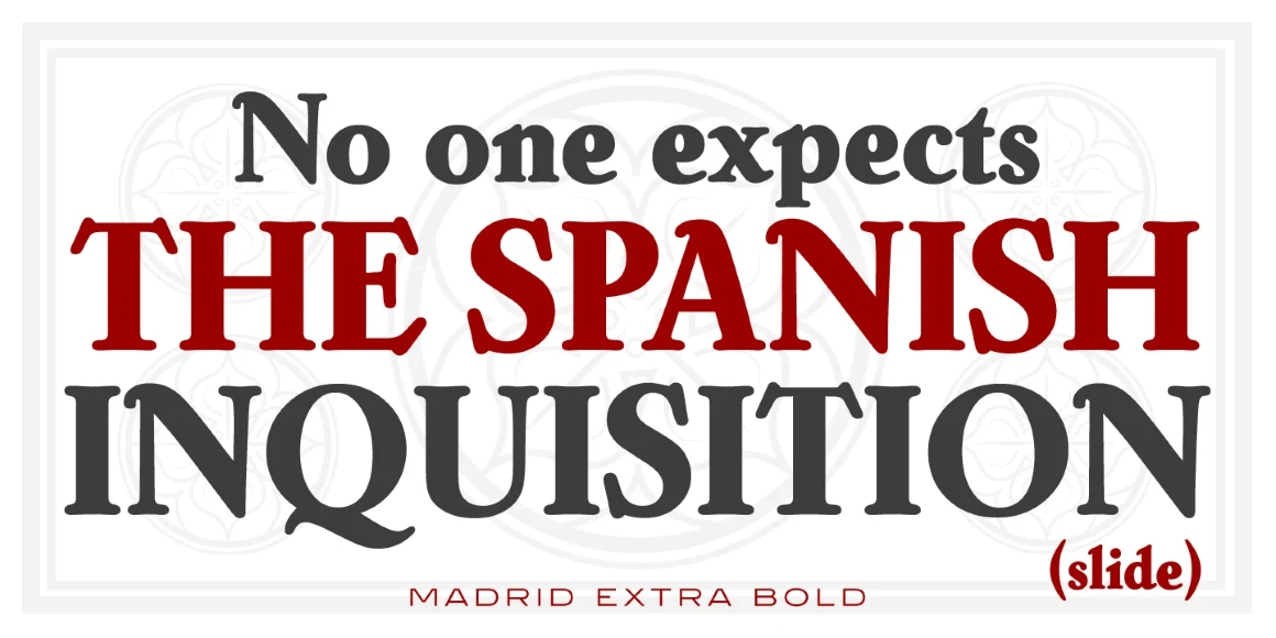 Madrid is a calligraphic roman font family that was digitally engineered by Steve Jackaman (ITF) exclusively for the Red Rooster Collection in 1997. It was inspired by Carlos Winkow’s typeface called “Nacional,” which was designed in 1941 for his foundry of the same name. Two weights of Nacional existed, Clásico Nacional 1 and Clásico Nacional Negro, and Jackaman created intermediary Medium and Extra Bold weights for this all-new family. Like the Spanish capital it is named for, the Madrid typeface is theatrical and decorative. The serifs are steeply inclined, some upper-case letters have hooks, and the glyphs have elegant pen-drawn qualities. Madrid is sure to bring its fiery passion to any project!
