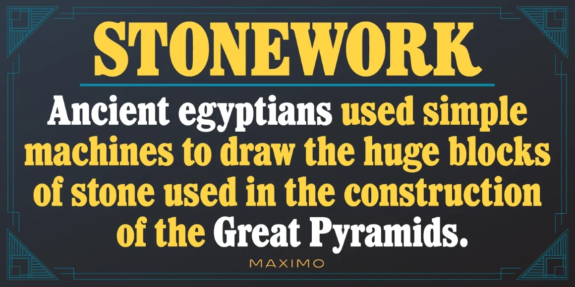 Maximo is a condensed Egyptian typeface, exclusively licensed from the Typsettra Collection. The original design, created by Les Usherwood (Typsettra), had roots as a metal typeface. Steve Jackaman (ITF) produced the current version of the font in 1997. Maximo, like many Egyptian faces, excels at display and subhead sizes. It is incredibly powerful in all caps, and yet its lowercase set still showcases a soft feel. Like many Usherwood and Jackaman typefaces, it was designed with utmost care with utility in mind.