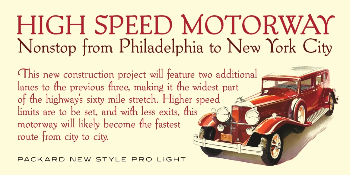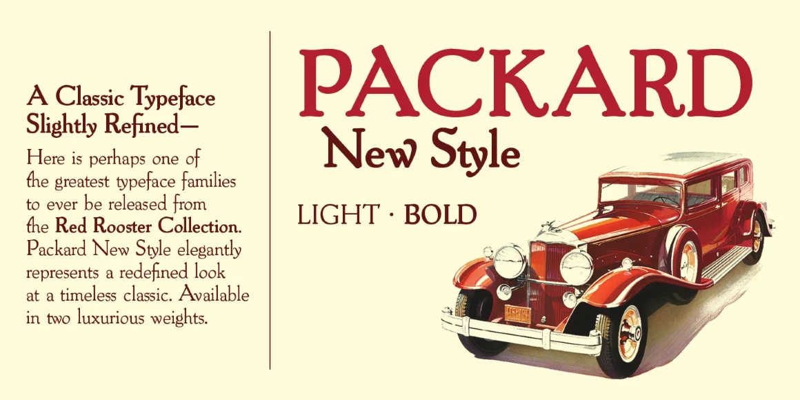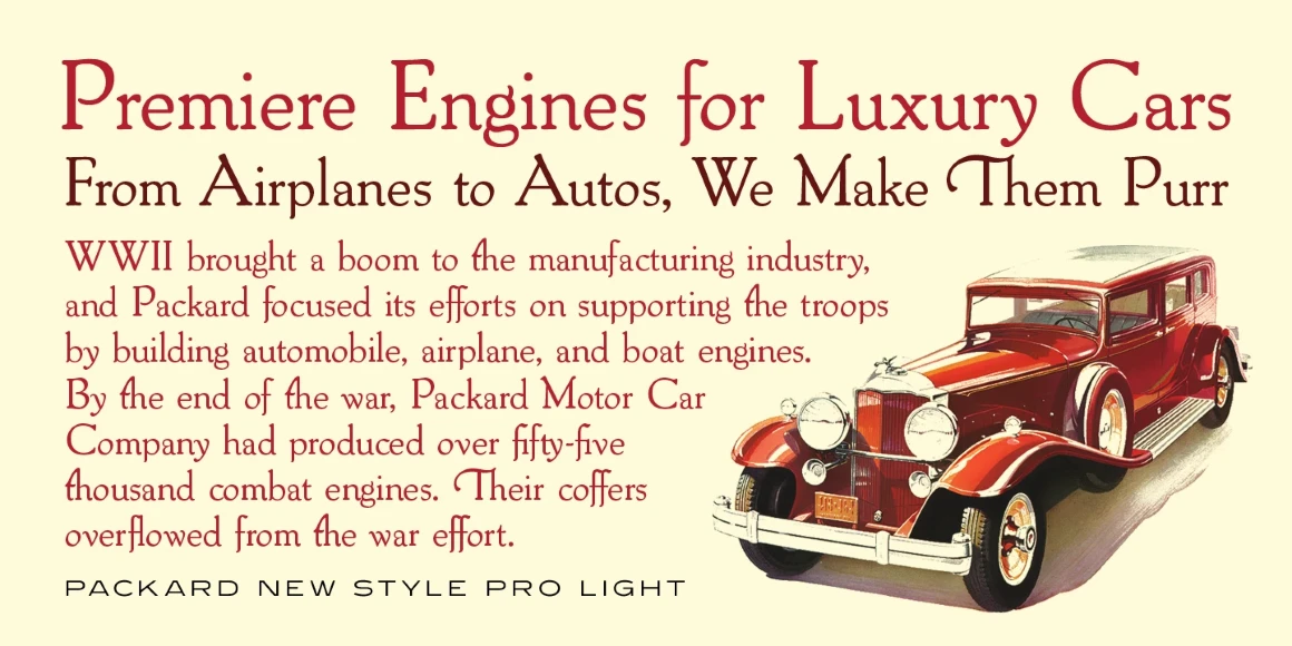 Packard New Style is a smooth old-style serif font family with a small x-height. It was created and produced by Steve Jackaman (ITF) and Ashley Muir in 2011. In 1916, Oswald Cooper of American Type Founders (ATF) created Packard Old Style for the Packard Motor Company. Morris F. Benton, also of ATF, is credited with adapting the original weight and creating an additional bold weight. When Jackaman and Muir updated Packard Old Style for the digital age, Packard New Style came to life alongside it. Packard New Style has a glorious golden-age advertising feel, and performs equally well in display and text. Several swashes were developed for added versatility and beauty.