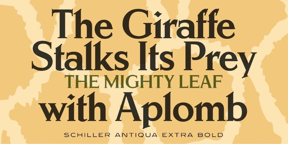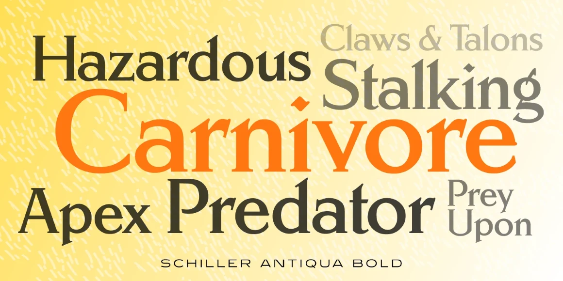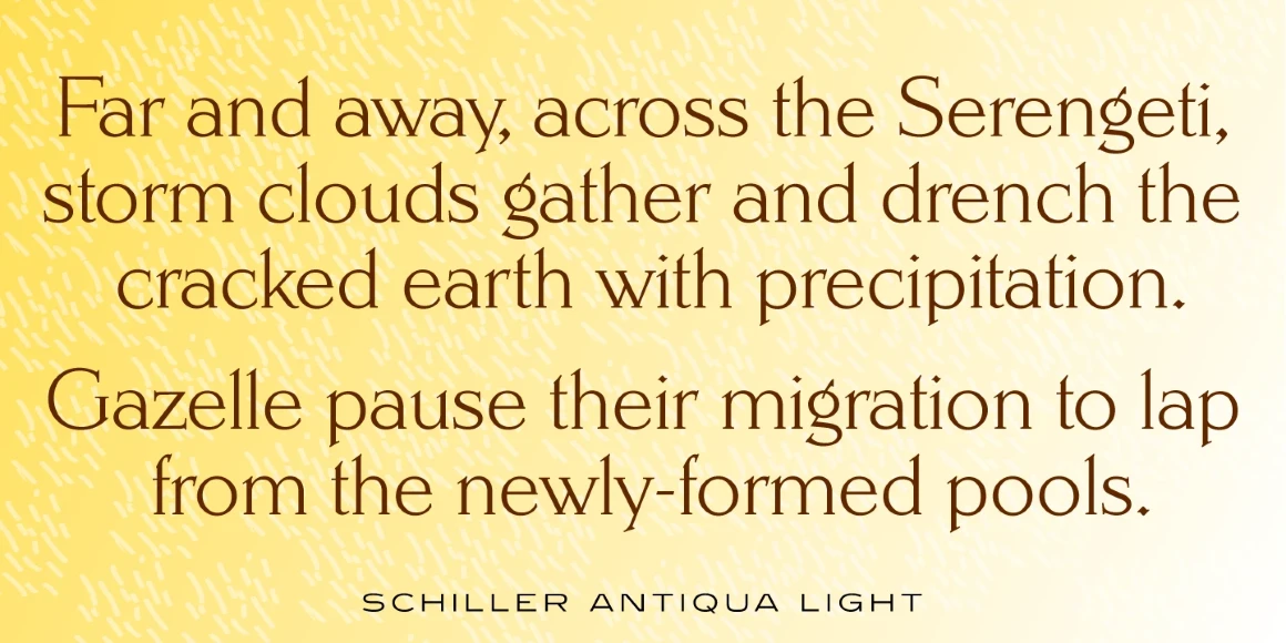 Schiller Antiqua is a decorative serif font family with a small x-height and distinctive letterforms. It was created and produced by Steve Jackaman (ITF) in 1993, and is based on “Hispalis” from Nacional, a Spanish foundry. During its operations, Nacional employed prestigious designers and was notable for its striking art deco typefaces. Schiller Antiqua, as its name suggests, has an antique look that stems from its 1900’s typographic influences. At paragraph size its serifs give it a crisp feel, and at display and subhead sizes its antique roots really shine through.