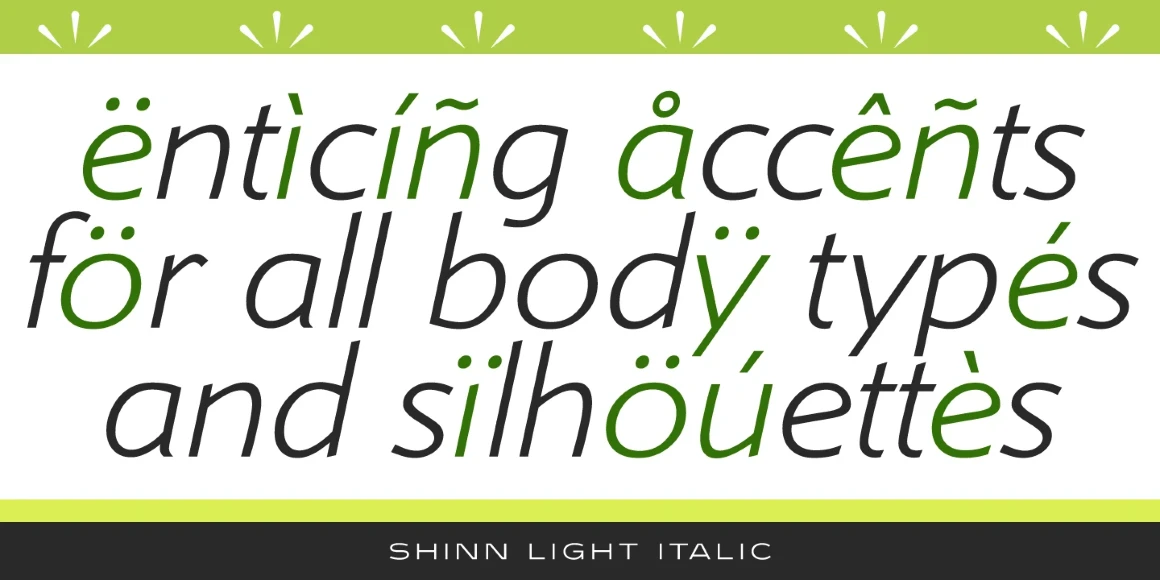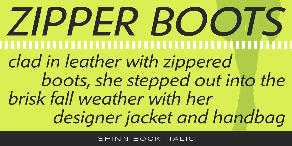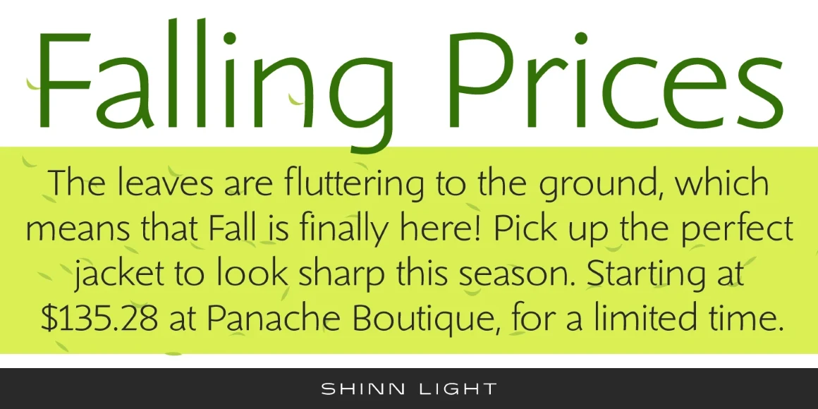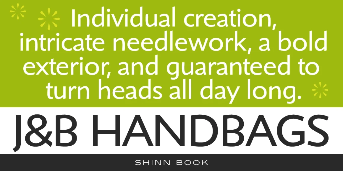 Shinn is a humanist sans serif font family with a calligraphic cut and tall ascenders. The Light, Medium, and Extra Bold weights were designed by Nick Shinn for Typsettra in 1985. Steve Jackaman (ITF) redrew and digitized the family in 1992, and added Book, Bold, and italic weights. Shinn has a casual modern feel, emphasized by its angled stems and high legibility.
