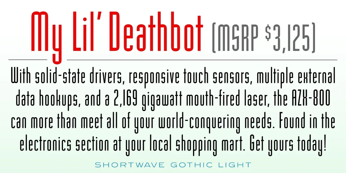 Shortwave Gothic is a decorative, compressed, and sans serif font family. The family was designed and produced by Steve Jackaman (ITF) in 2003. Being a (modest) shortwave radio fan, Jackaman was inspired to design a typeface that celebrates this incredible technology. The smooth curves and geometric sharp angles incorporated into this unique typeface are meant to symbolize and encapsulate the “tuning” of the radio signals.