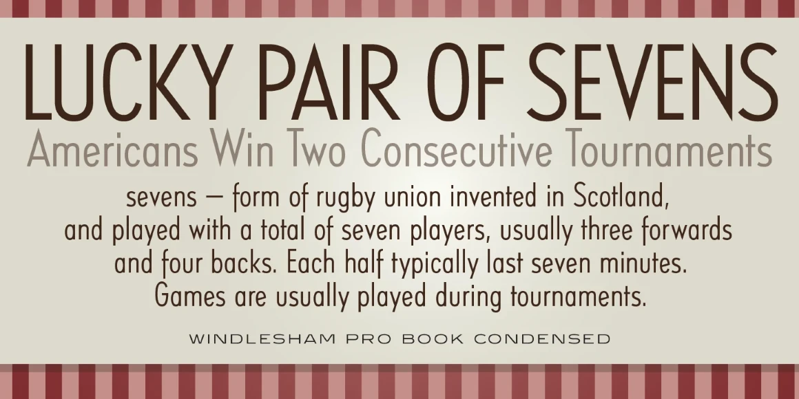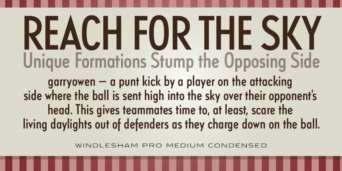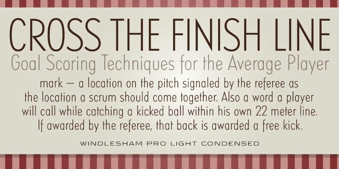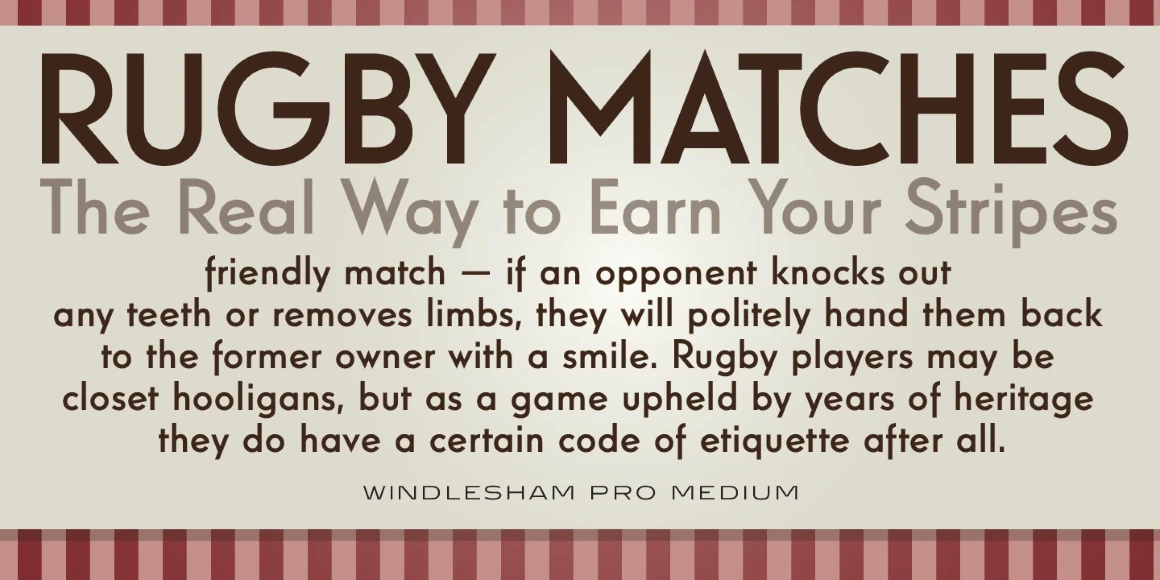 Windlesham is a sans serif font family, and is sister to International TypeFounders’ ‘Guildford Pro’ and ‘Relish Pro’ typefaces. It was created and produced by Steve Jackaman (ITF) and Ashley Muir in 2011. The family is named after the village of Windlesham in Surrey, England, which was home to the “Brickmakers Arms,” a country pub dear to Jackaman’s heart. Windlesham has a geometric modern look. Wherever Windlesham is utilized, whether it be in paragraph or display size, a visual cleanliness is always present.