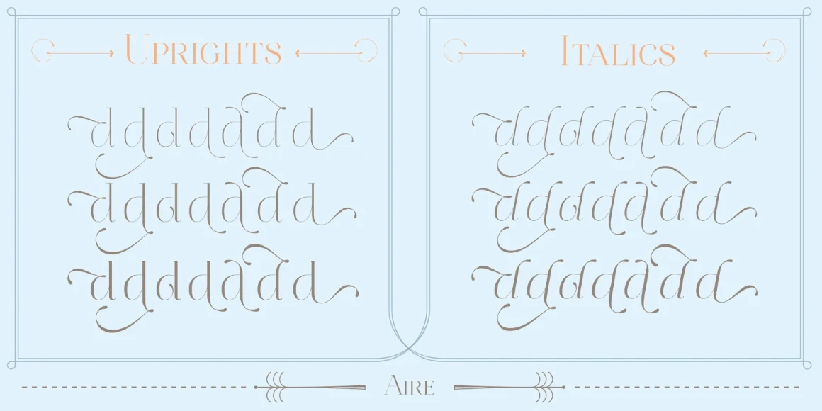 Aire is a delicately sophisticated serif family. It brings elegance and lightness, something softer, more fragile, and even a little playful to display typography. The slight contrast, sculptural curves, open shapes, and whimsical alternates give a graceful balance of refinement and flourish with enough personality to carry an entire composition. Whether for dazzling editorial headlines, a sparkling title sequence, or shimmering packaging — Aire is the right choice, par excellence!