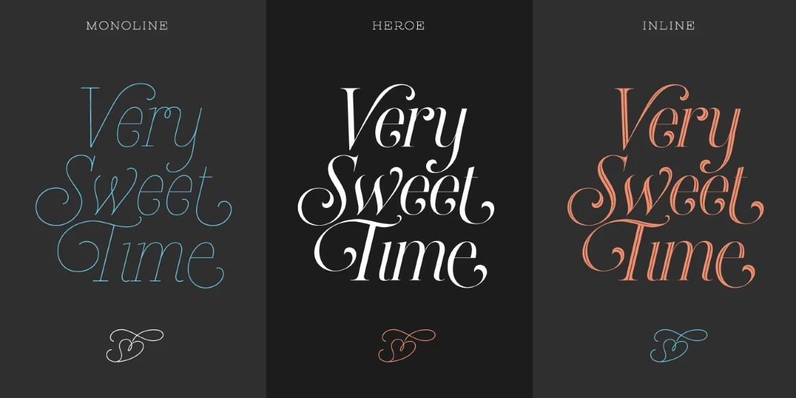 Heroe is a stylized italic full of surprising elegance and sharp visual drama. With delicate hairlines, unique ball terminals, and poetic curves, it takes some aspects of the classic Roman model and pushes them into expressive territory. The font family includes Regular, Monoline Big, Monoline Small, a striking Inline style, and Fleurons! Heroe is perfect for fashion magazines, perfume packaging, wedding invitations, or any luxury brand calling for sophistication with flair.